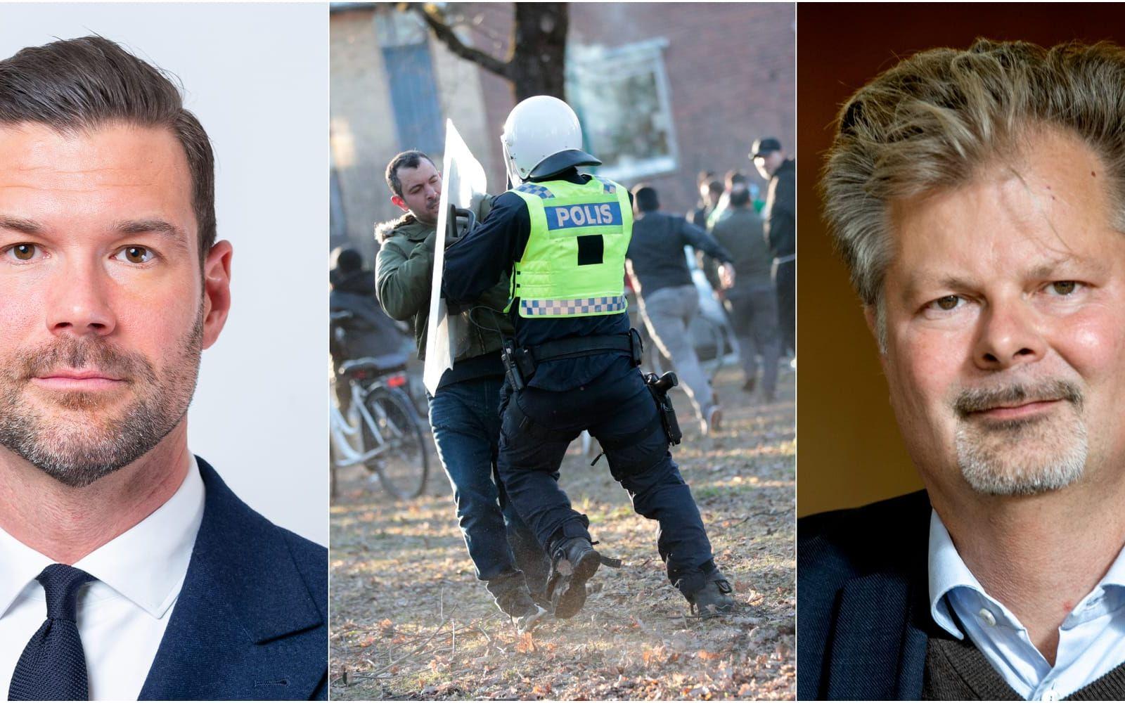 Upplopp som slutar med 100 skadade poliser, ett stort antal förstörda polisbilar och en brinnande skola är inget annat än ett enormt misslyckande för den förda politiken, skriver debattörerna. Bild: Kicki Nilsson/TT