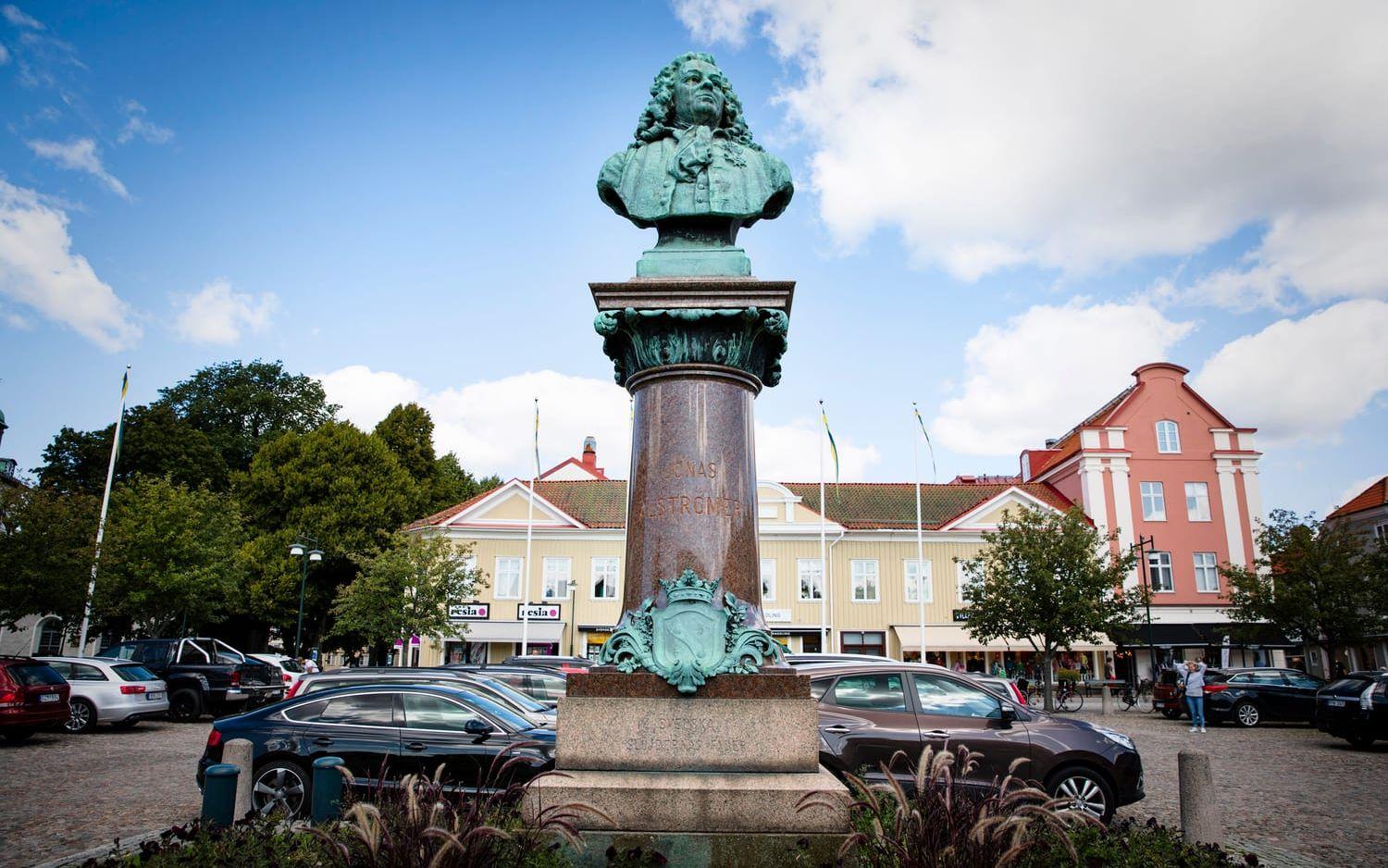 Ändå är Alingsås en vilsen stad. Smått schizofren faktiskt. Det är som om de 26 000 medborgarna inte riktigt begripit vilken kulturskatt de sitter på. Eller vad sägs om den här stadssloganen: ”Alingsås, här parkerar du gratis i hela centrum!” Desperat som en inkastare på en sjaskig bakgata. Något som lett till att både Stora och Lilla torget idag är bilhav – potatiskungen och alingsåsaren Jonas Alströmers gröna bronshuvud sticker upp som ett rundningsmärke mellan de böljande biltaken.