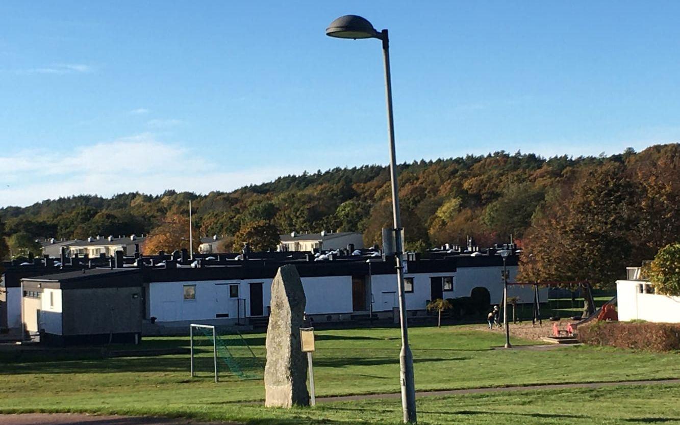 Fornminnet tronar i ensamt majestät, mitt i ett större grönområde, inte inne bland de många radhusen i området. Om den nu står kvar på sin ursprungliga plats.