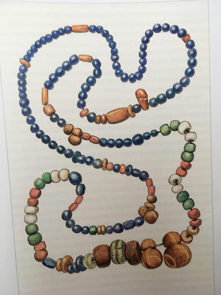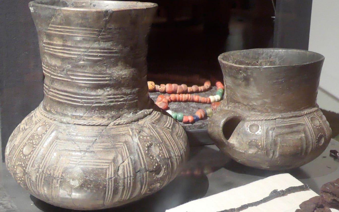 I en glasmonter finns ett par höghalsade och rikt dekorerade keramikkärl. Man kan urskilja runda fördjupningar i godset, som om konstnären tryckt in sitt pekfinger i leran. De runda fördjupningarna är omgivna av prickar. Ska de kanske föreställa solar med strålar?