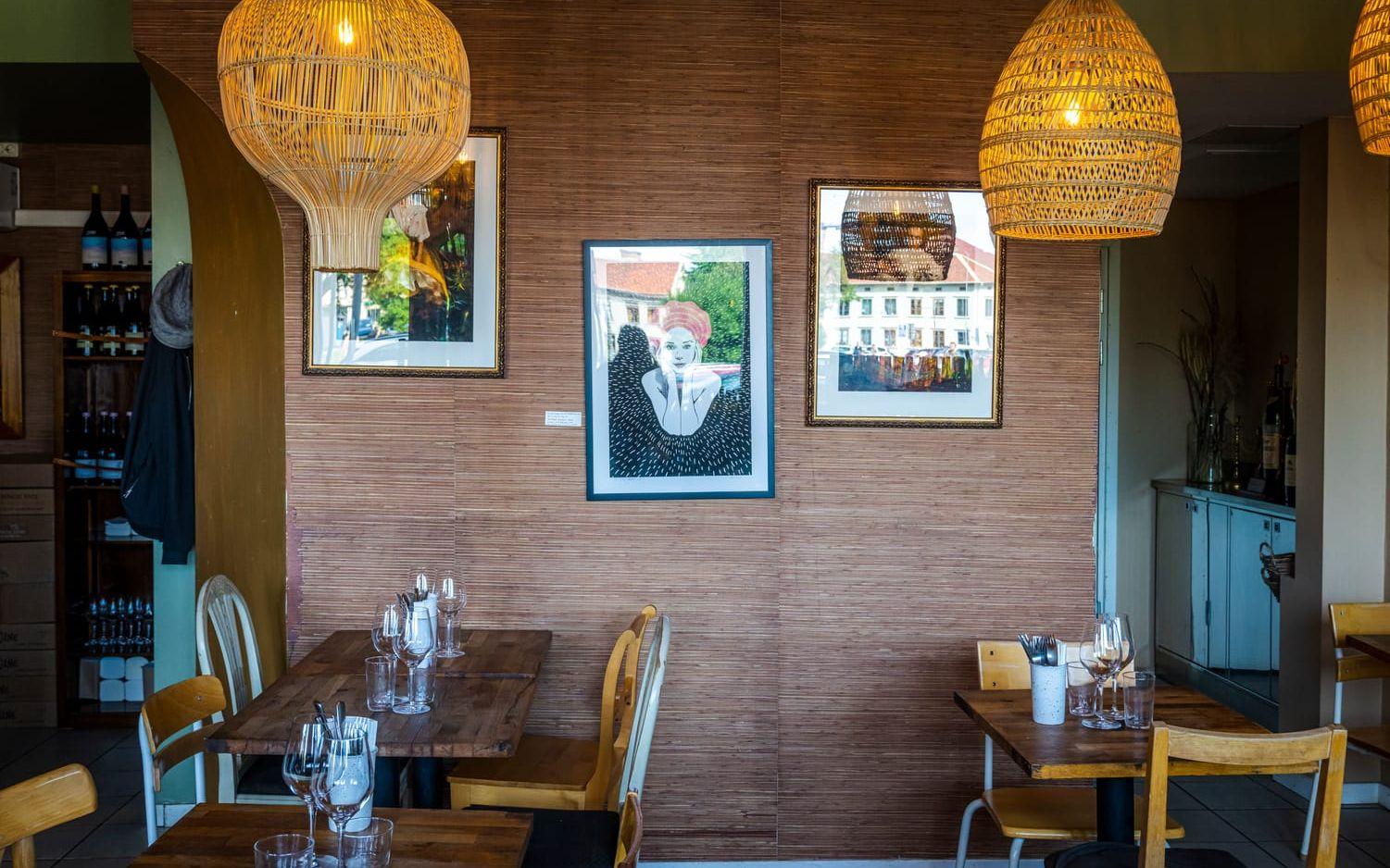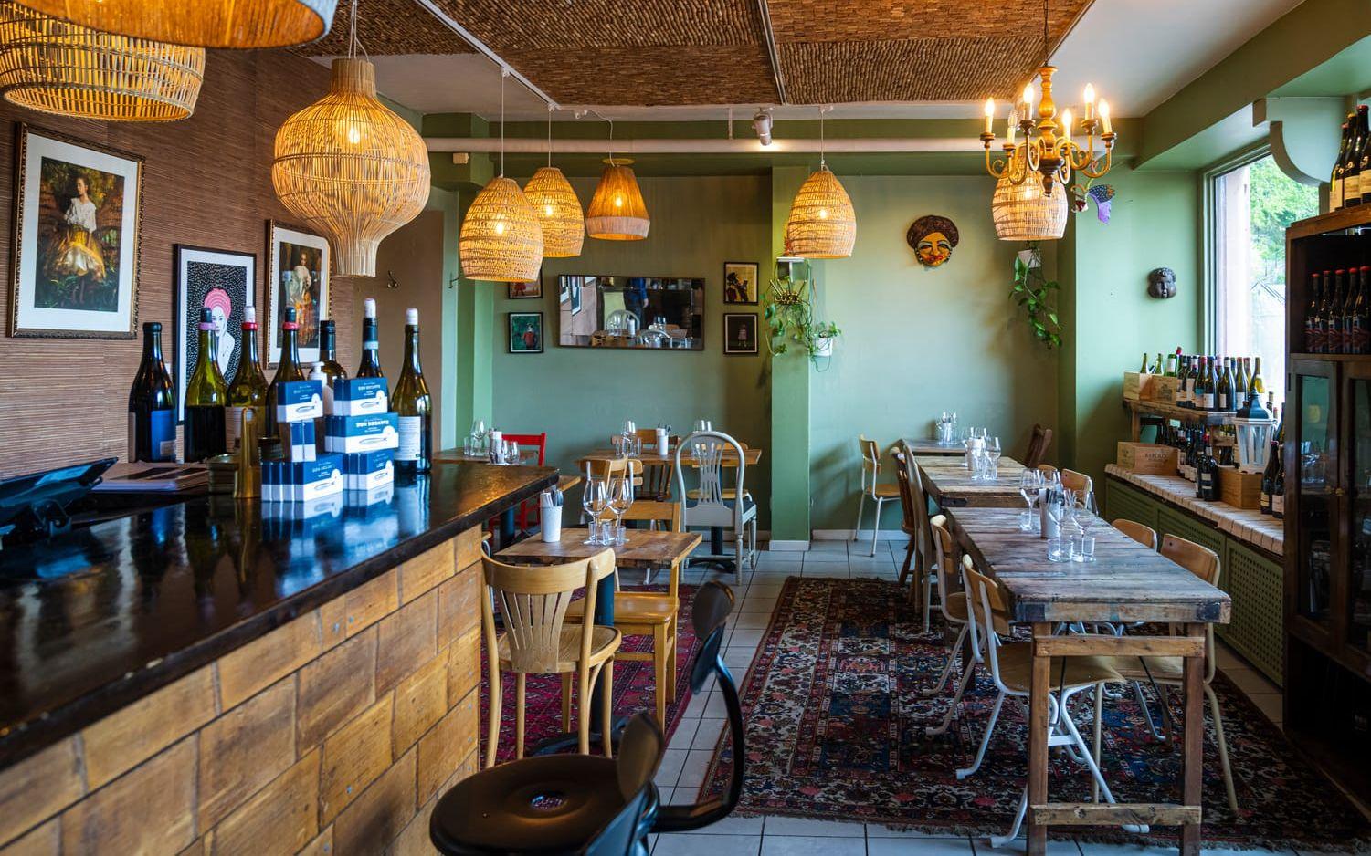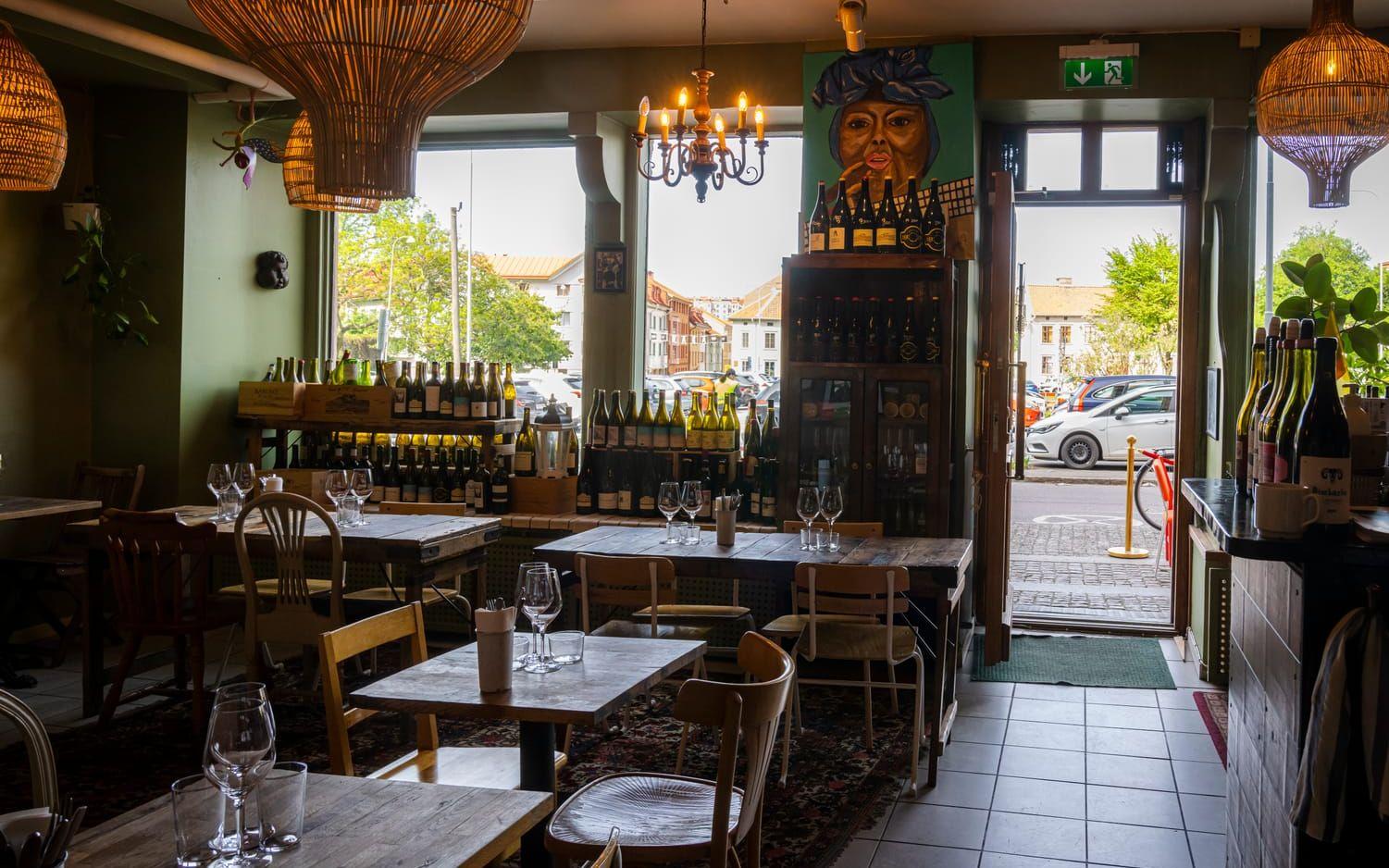 Miljön är omedelbart välkomnande. Orientmattor på golvet, rustika bord och öppna vinhyllor längs väggarna, lampor med skärm, loppisfynd och prylar som kan ha hängt med hem efter en backpackertur. Vi har inte varit här tidigare, men känner oss ändå hemma denna vardagskväll.