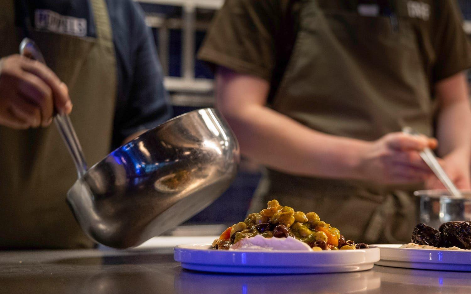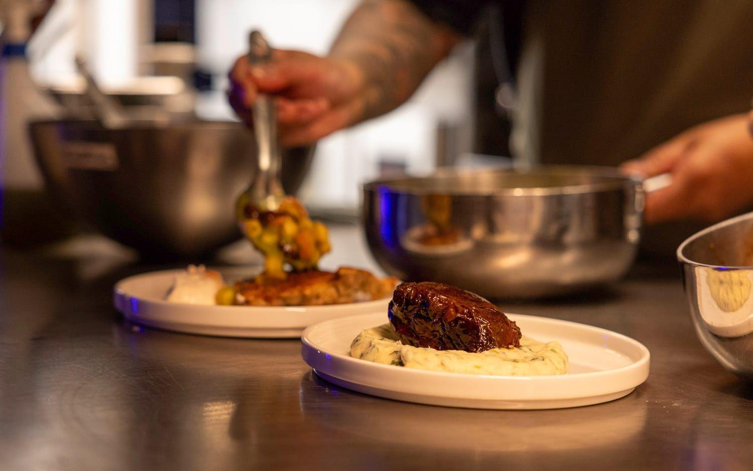 Dags för huvudrätter. Örtbakad pumpa i brynt smör och svampsoja (295 kr) serveras på en smakrik och matig rotselleripuré toppad med finriven sallad och rotfruktschips. Den andra varmrätten är likadan, fast pumpan har bytts ut mot oxkind brässerad i imperial stout (295 kr). Det är vällagat och gott, men ingredienserna är travade på varandra på den lilla tallriken och allt blandas i en enda röra när vi äter.