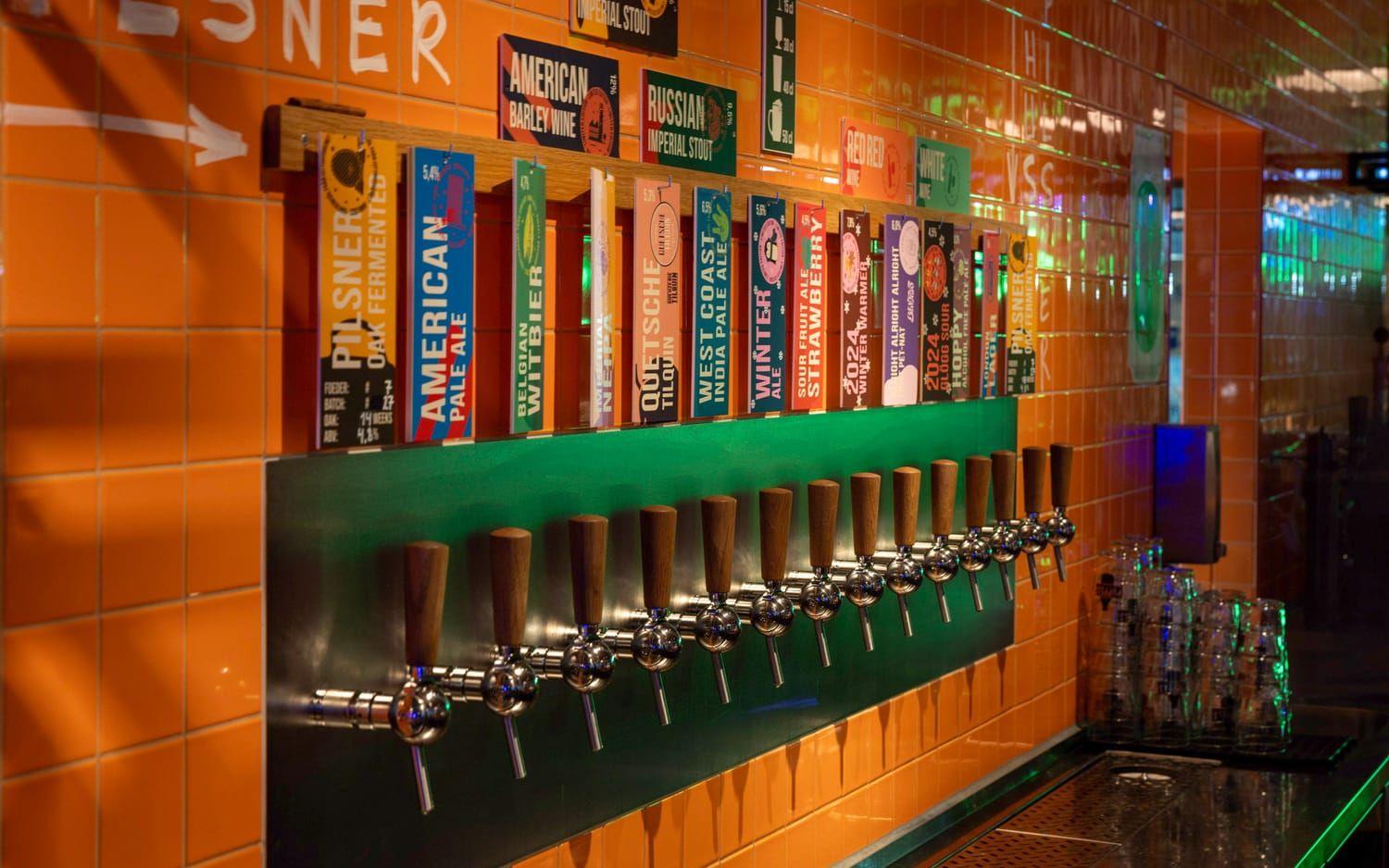 Bland personalen finns många som välvilligt hjälper oss genom ölmenyn. Vi landar på åtta öl, i nyanser från ljust gult till nästan svart, flera som ännu inte kommit ut på marknaden. Priset för de små glasen ligger mellan 26 kr (huspilsnern) och 125 kr (Hot Shot Imperial Stout); de flesta mellan 40 och 50 kr.