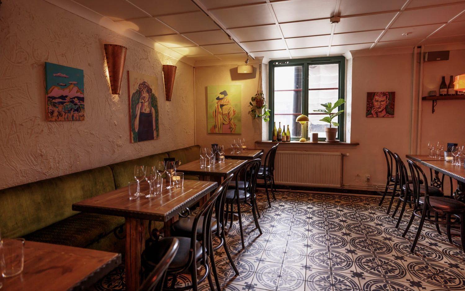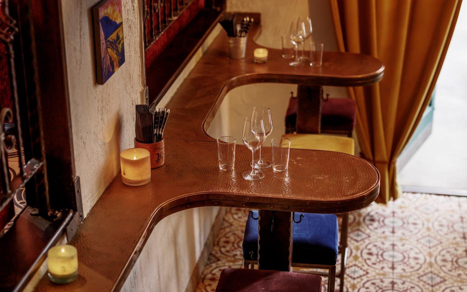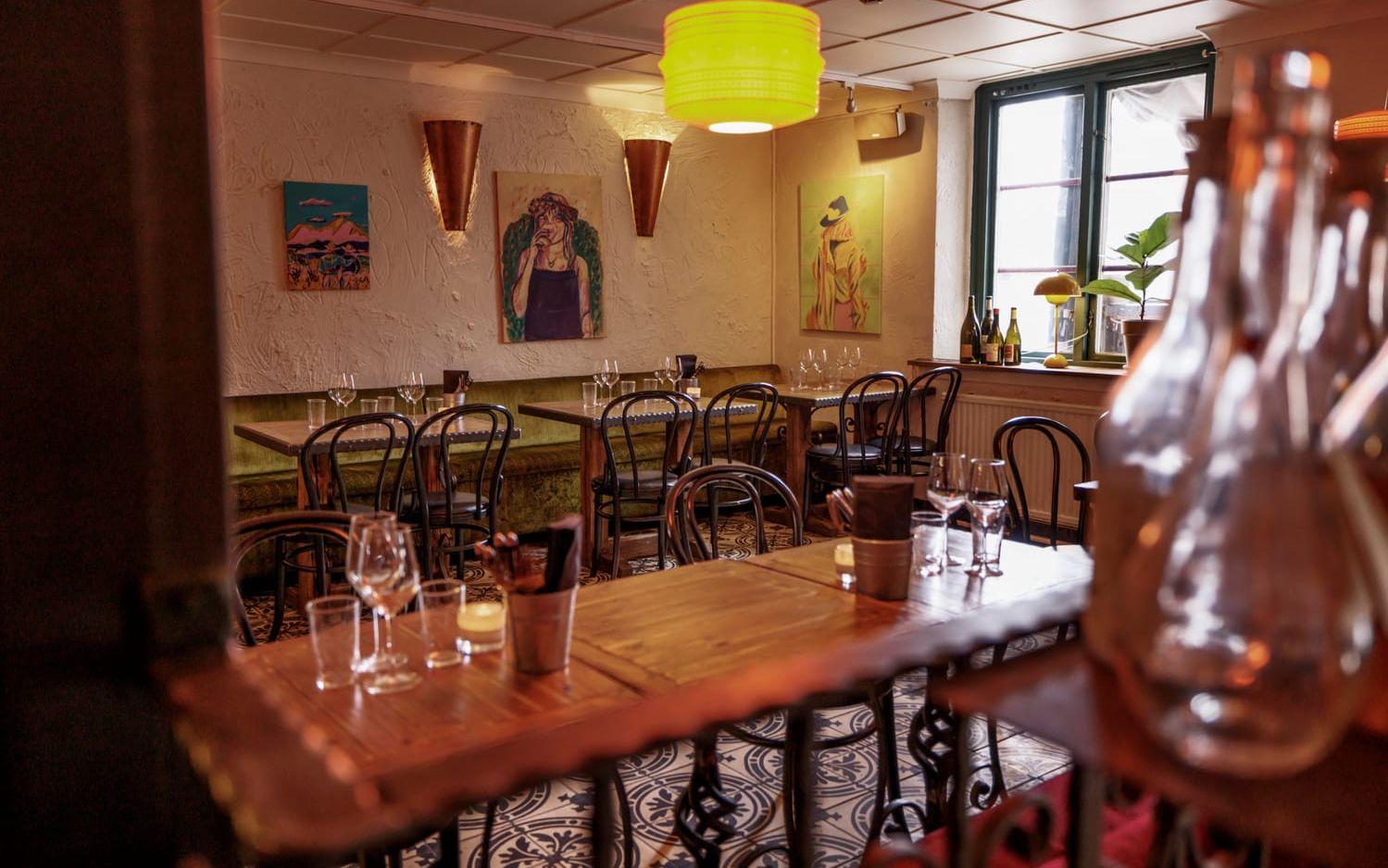 Det är näst intill fullsatt av solkyssta göteborgare när vi kliver in genom dörren till den inglasade uteserveringen. Vi får dock följa med in, upp för den smala trappan och sätta oss i den något mer glesbefolkade lokalen, som ska komma att fyllas på. Det är en härligt murrig atmosfär med mosaik, koppar och varm belysning. I andra änden av rummet hör man slammer från köket och i samma sekund som man tänker ”vardagsrummigt” smiter kocken ut genom en dörr där man kan skymta en helt vanlig trappuppgång. Det visar sig att lokalen mycket riktigt var en lägenhet tidigare. Hemtrevligt, var ordet.
