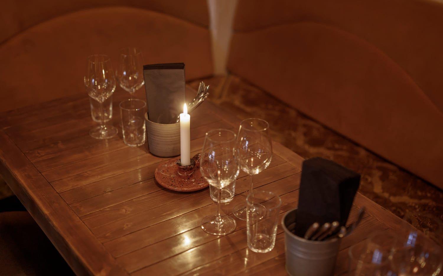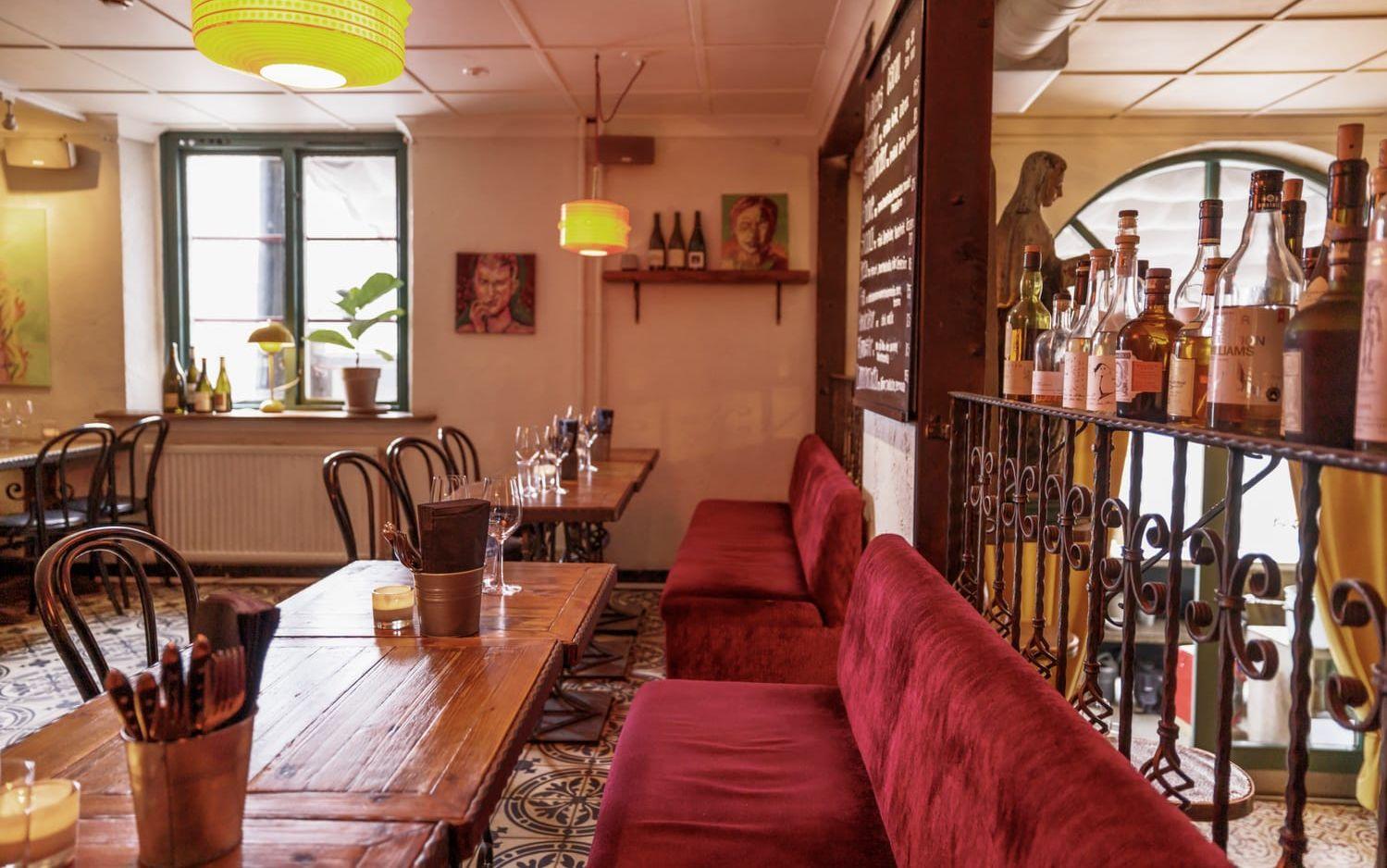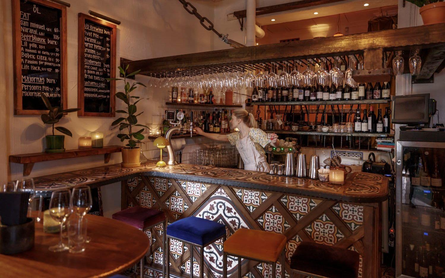 Det är näst intill fullsatt av solkyssta göteborgare när vi kliver in genom dörren till den inglasade uteserveringen. Vi får dock följa med in, upp för den smala trappan och sätta oss i den något mer glesbefolkade lokalen, som ska komma att fyllas på. Det är en härligt murrig atmosfär med mosaik, koppar och varm belysning. I andra änden av rummet hör man slammer från köket och i samma sekund som man tänker ”vardagsrummigt” smiter kocken ut genom en dörr där man kan skymta en helt vanlig trappuppgång. Det visar sig att lokalen mycket riktigt var en lägenhet tidigare. Hemtrevligt, var ordet.