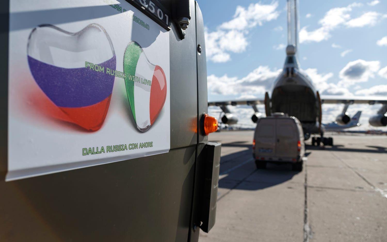 Samtidigt rullar en rysk militärenhet, specialiserad på att hantera kemisk och biologisk krigföring, in i norditalienska Albino och desinficerar ett äldreboende. Stora mängder ansiktsmasker har dessutom flugits in med militärflyg. Vissa hävdar att materialet är föråldrat och onödigt. Andra menar att det visar vilka Italiens sanna vänner är. I italiensk media sprids nyheterna om Rysslands och Putins solidaritet.