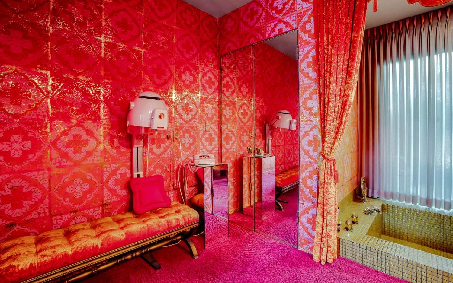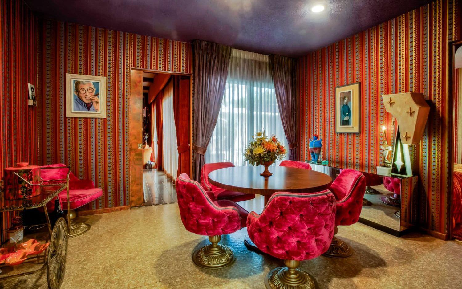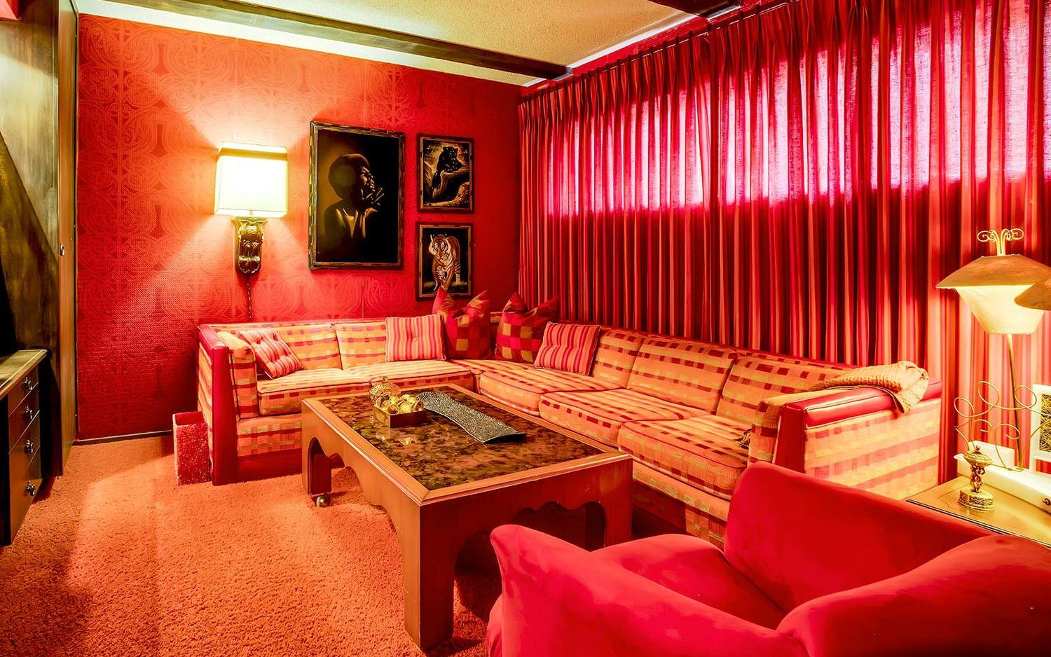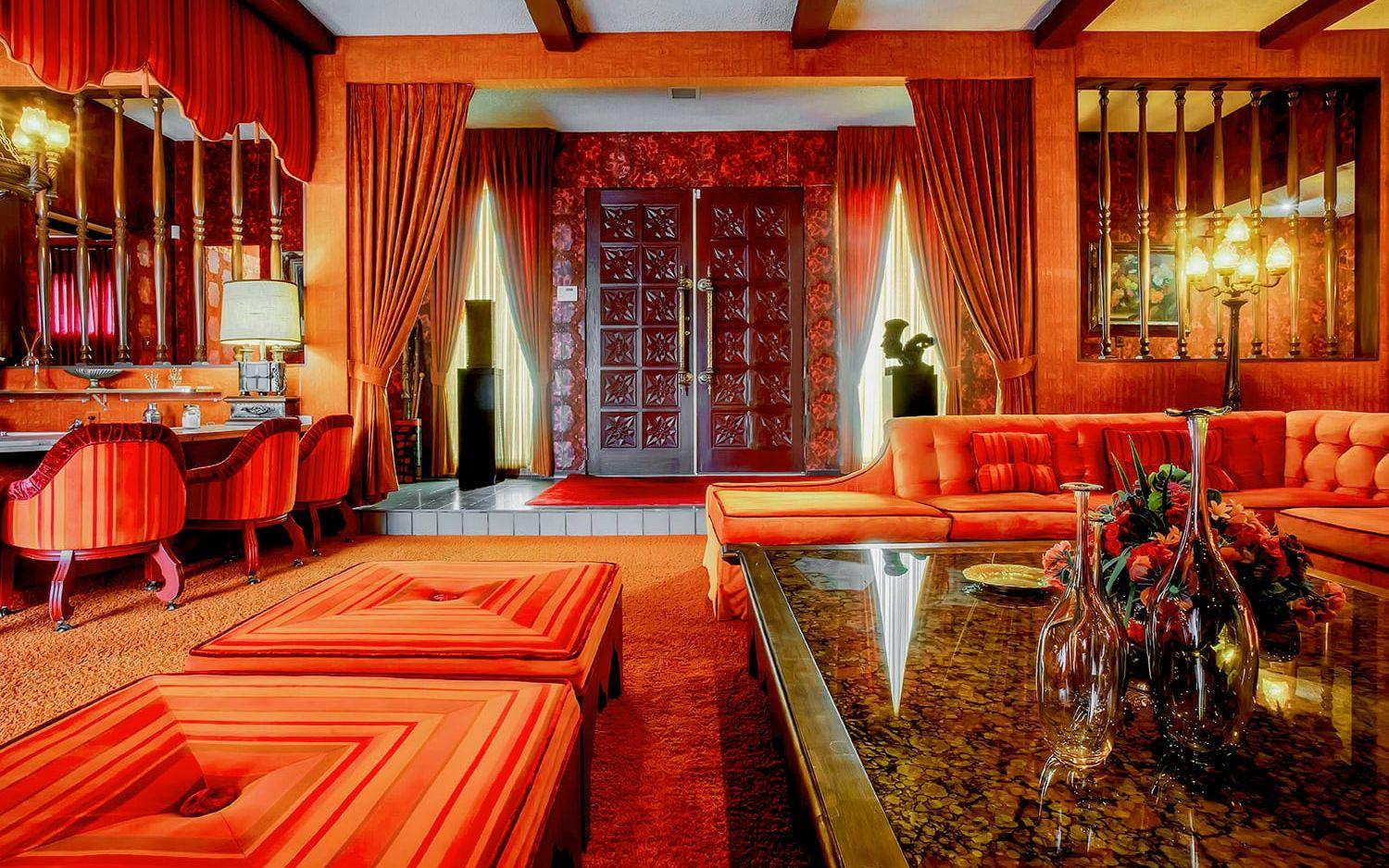 Nu är huset till salu och det är onekligen ett unikt hem som säljs. För 20 miljoner kronor får man ett hus på 300 kvadratmeter innehållande bland annat fyra sovrum, fem färgglada badrum, ett rött nedsänkt vardagsrum med bar och öppen spis, matsal med stora plyschstolar, ett frukostrum, ett kök i brunt och senapsgult och en orange tvättstuga.