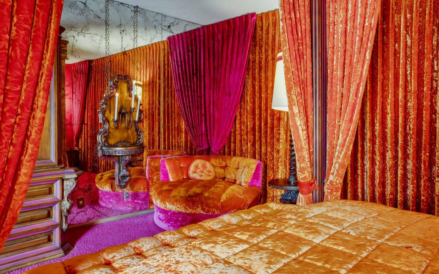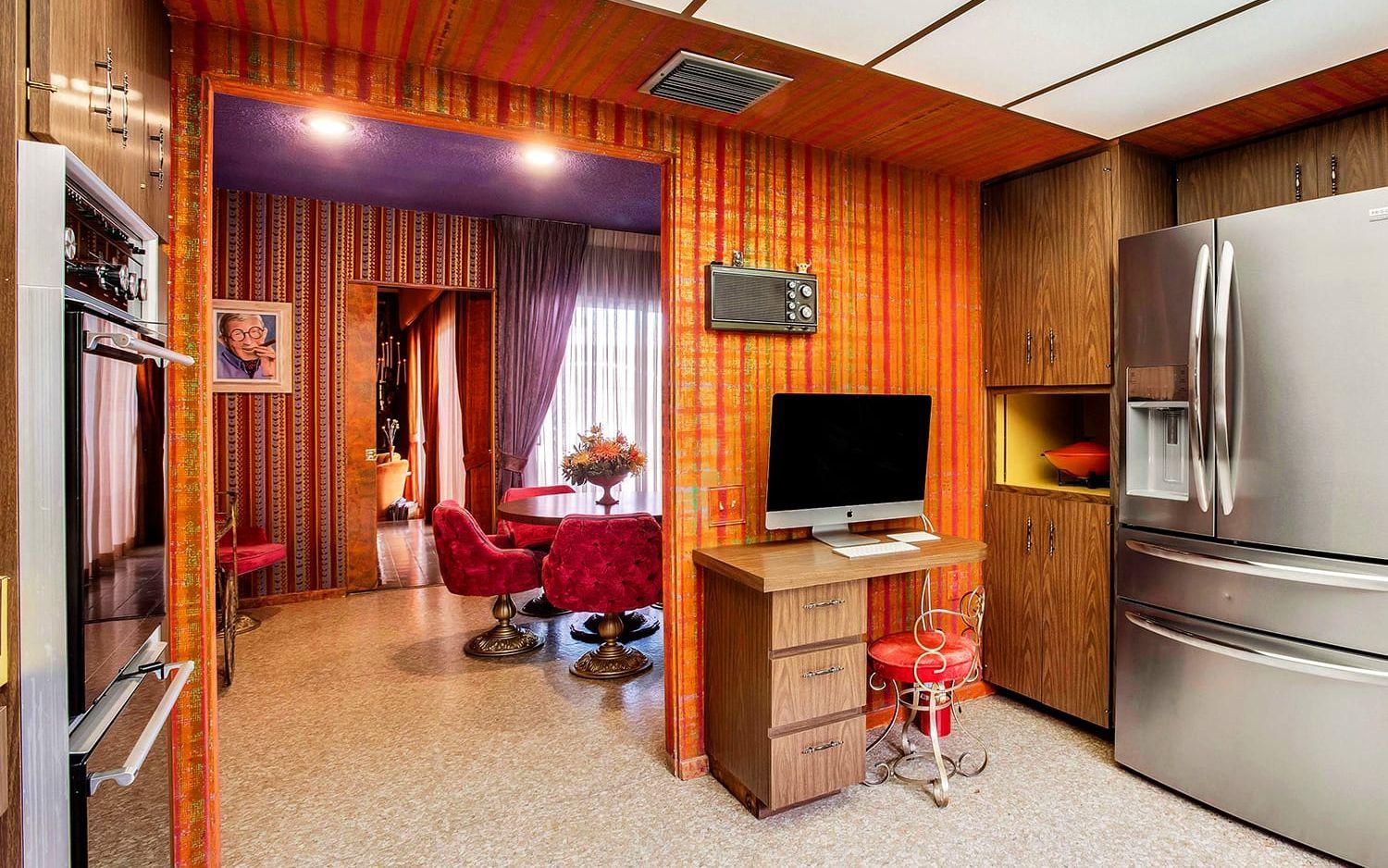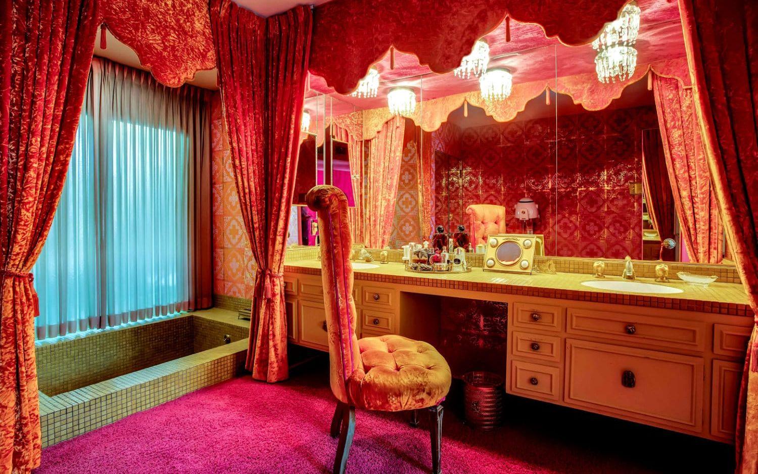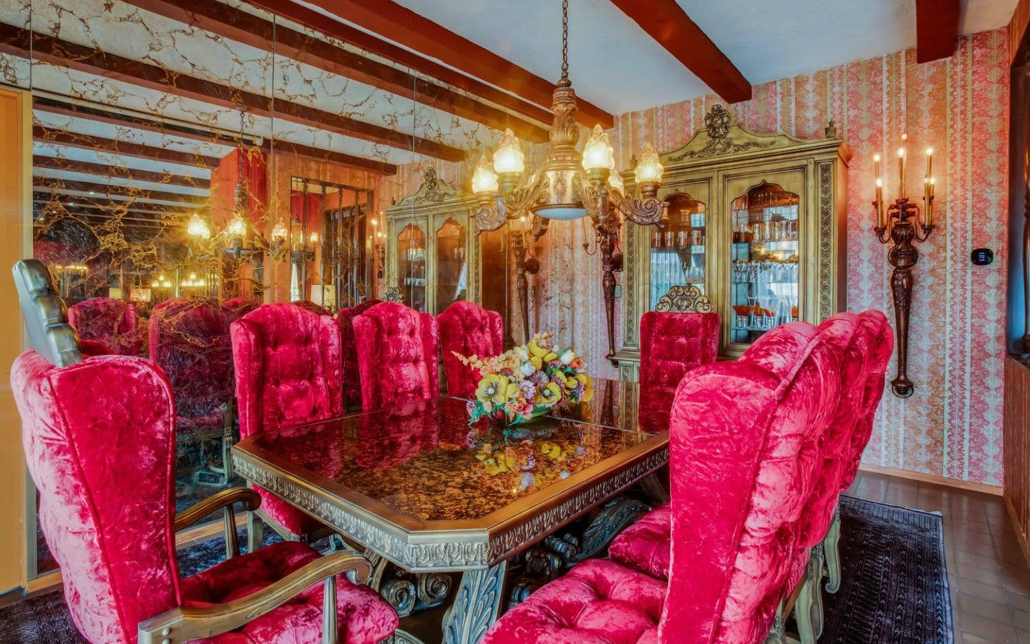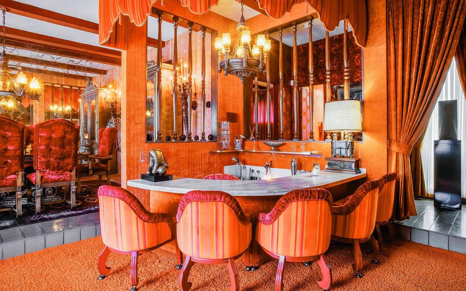 Nu är huset till salu och det är onekligen ett unikt hem som säljs. För 20 miljoner kronor får man ett hus på 300 kvadratmeter innehållande bland annat fyra sovrum, fem färgglada badrum, ett rött nedsänkt vardagsrum med bar och öppen spis, matsal med stora plyschstolar, ett frukostrum, ett kök i brunt och senapsgult och en orange tvättstuga.