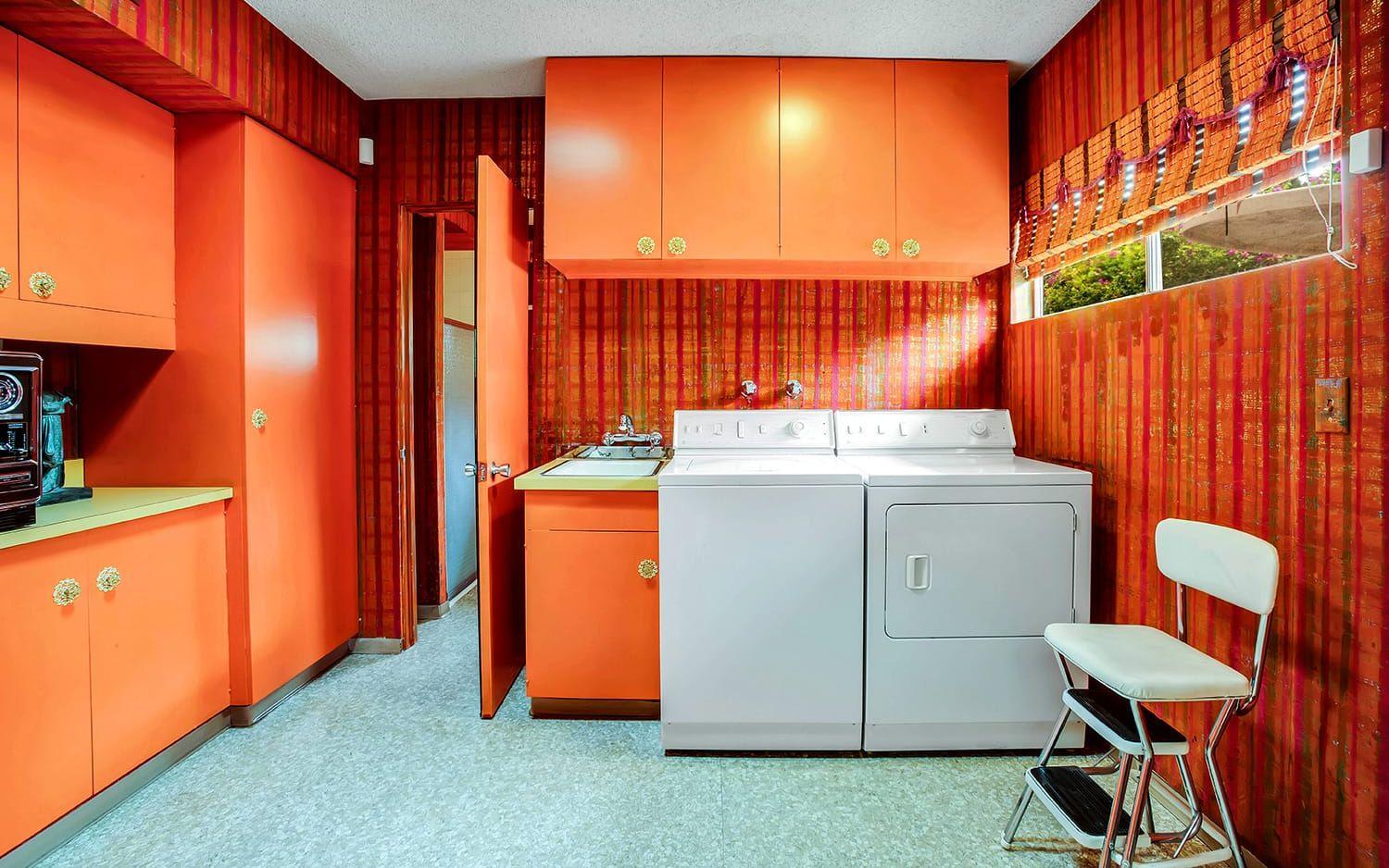 Huset har en orange tvättstuga