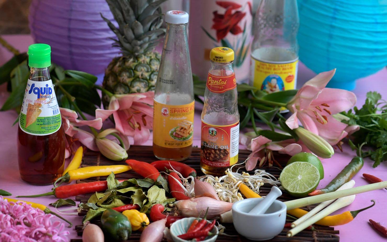 Thailändsk mat bygger på grundstenarna surt, salt, sött och starkt. Lime kombineras med socker (ibland palmsocker) och fisksås, som ger både sälta och den femte grundsmaken umami, och paras sedan ihop med chilistark hetta.