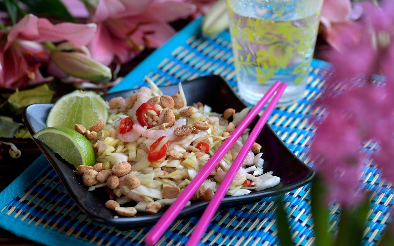Det här är en klassisk thailändsk sallad som jag bara älskar. Syrligt, starkt och salt på samma gång. Egentligen görs den med grön omogen papaya som finns i asiatiska butiker, det är viktigt att den är omogen, men du kan också använda vitkål.