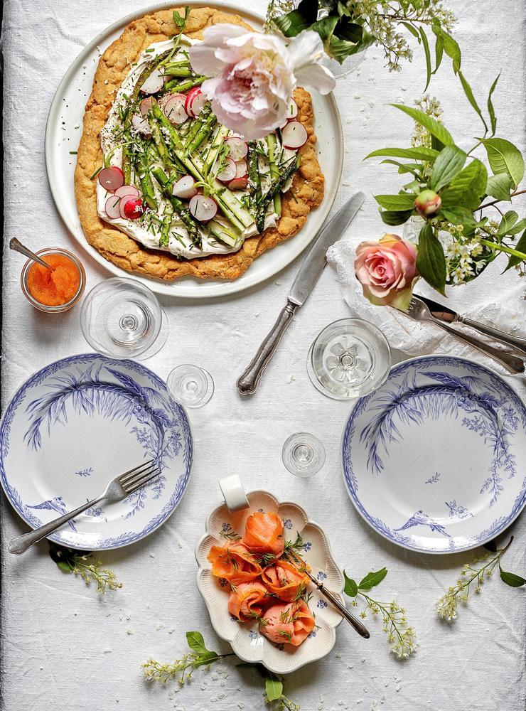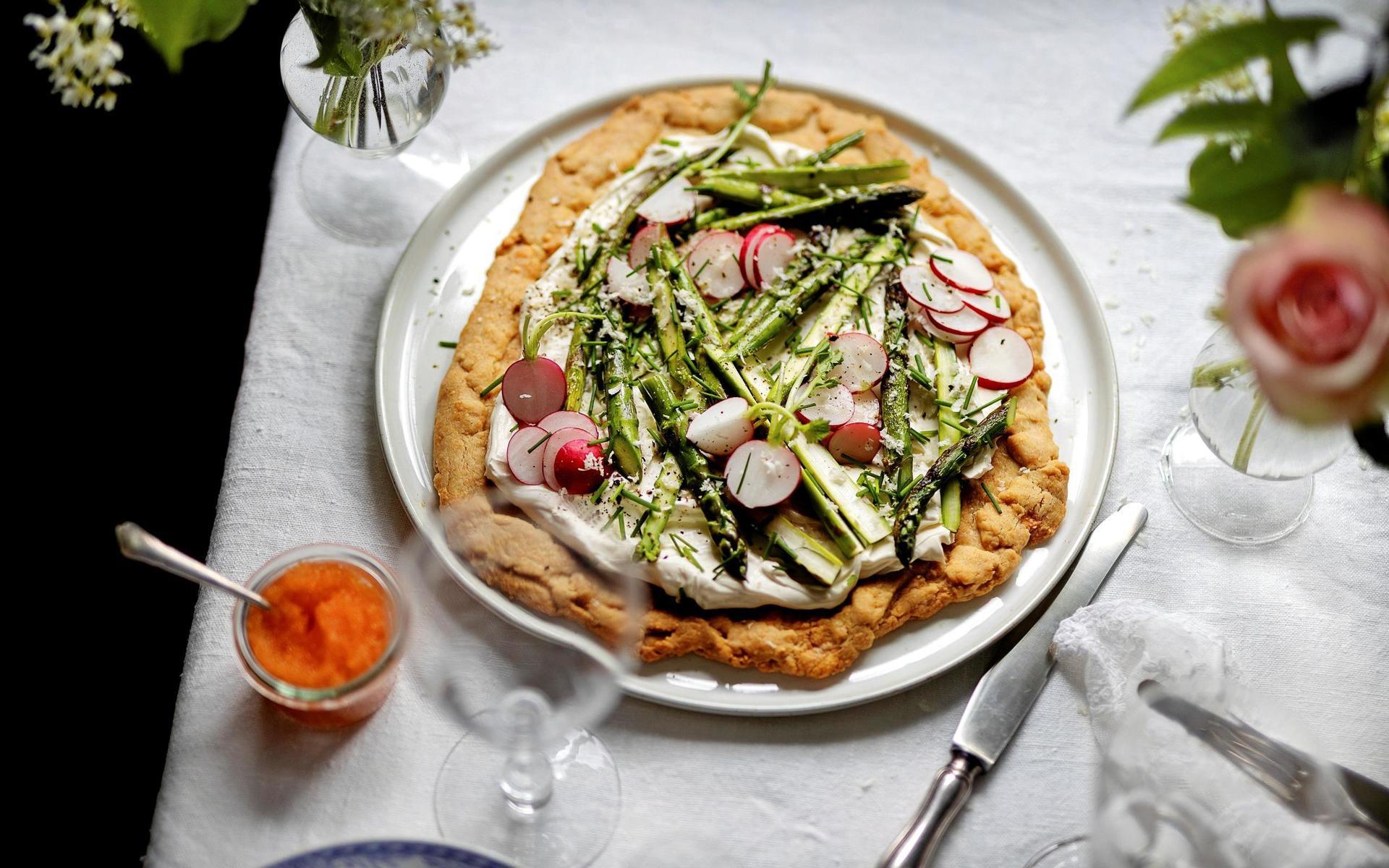 Toppa pajen med pepparrotskrämen, grönsaker, örter och finriv extra pepparrot på toppen, krydda med lite svartpeppar. Ät gärna till löjrom, rökt lax eller sill.