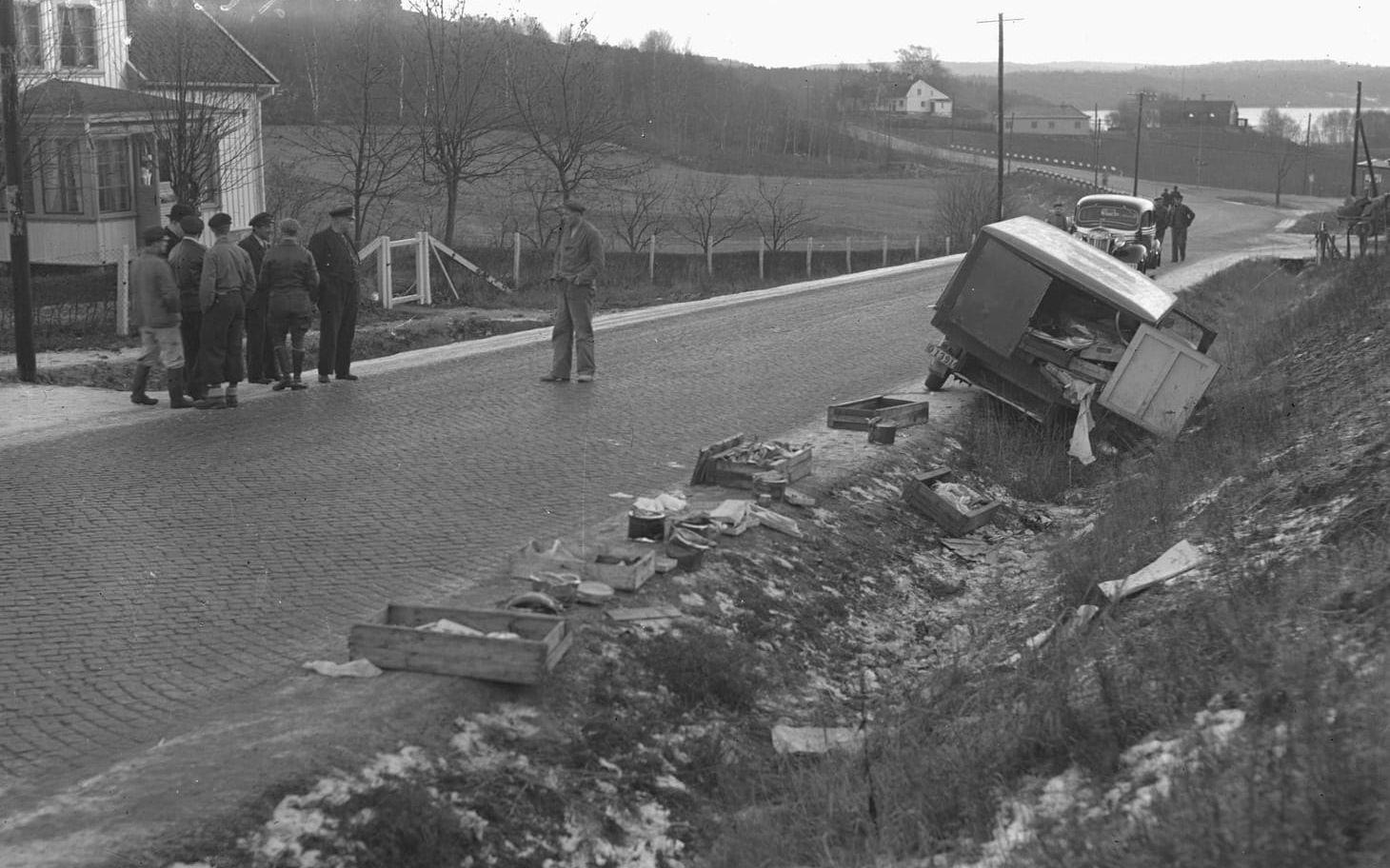 Det föreställer en skåpbil som har kört i diket. Det är en fiskhandlares skåpbil. Längs vägkanten har denna havererade fiskbil lämnat ett vackert spår av lådor med makrill, torsk och kolja.
