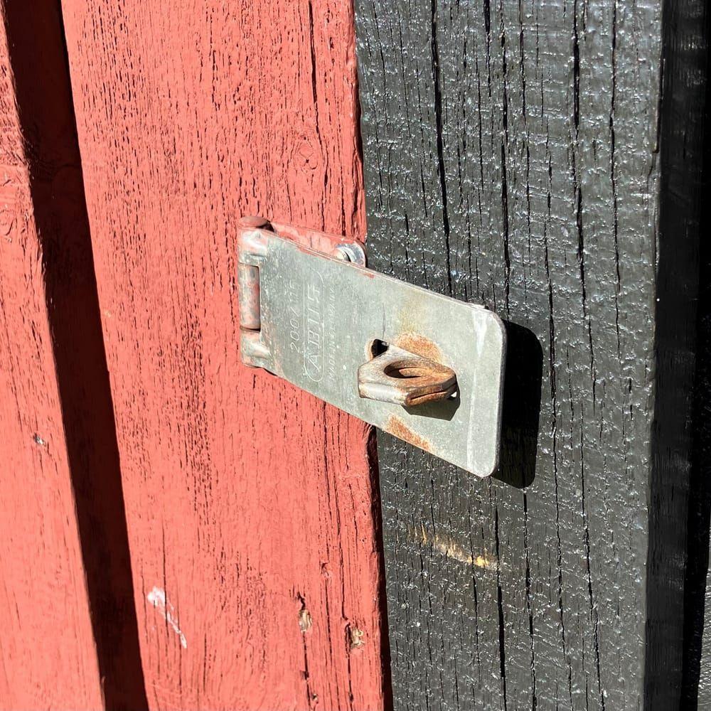 Vinden hade blåst igen haspen, alltså metallplattan som sitter fast i väggen, och lagt den över märlan på dörren, som hänglåset träs genom för att låsa fast haspen.