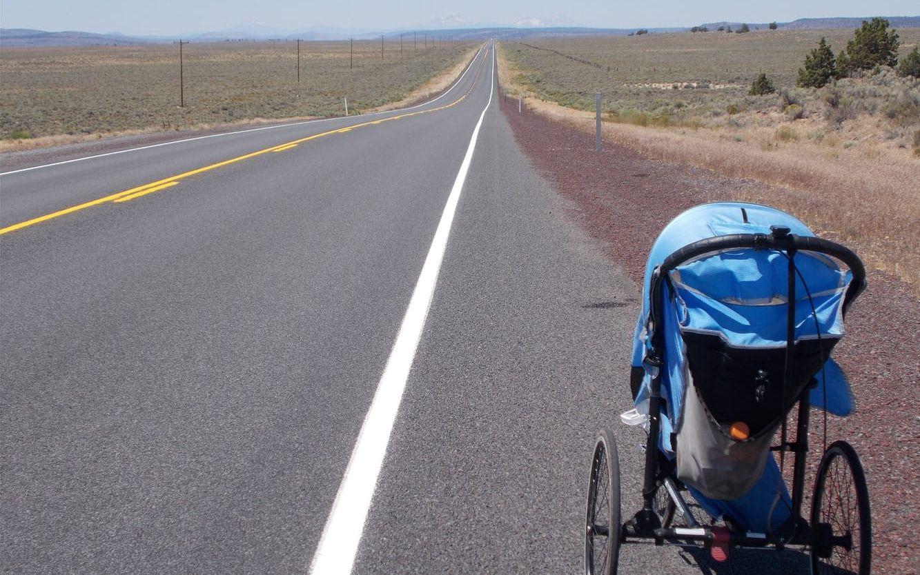 Björn har sin packning i en trehjulig baby jogger. Här inför "oändliga raksträckor" i Oregons ökenlandskap. Bild: Privat