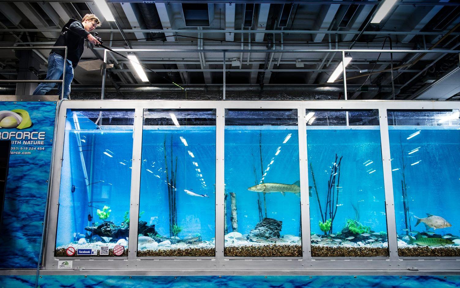 Är man fiskeintresserad finns ett gigantiskt akvarium, i år fyllt med svenska fiskar som gädda, mört och abborre. Här visar fiskebutikerna och tillverkarna av fiskeutrustning hur utrustning som fiskedrag funkar. Christian Karlsson som jobbar som fiskeguide i Nord-Norge testar ett drag. Akvariet, som är fyllt med 20 000 liter vatten, flyttas runt på olika mässor i Europa berättaren ägaren Alex Tomás. För dem som gillar segelbåtar visas för första gången en More 55, det är den största segelbåten på mässan med sina nära 17 meter. Båten har fem hytter med sovplats för 14 personer, tre toaletter med dusch och ett kök som passar för matlagning. Priset för denna båt är drygt fyra miljoner kronor, berättar Malin Stom på More Sailing.