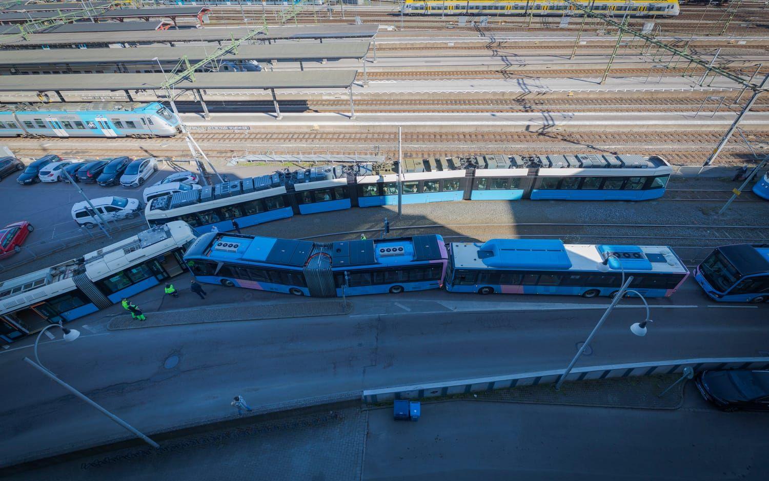 Spårvagnen spårade ur i samband med krocken. Ytterligare en buss krockade in i bussen framför i kollisionen.