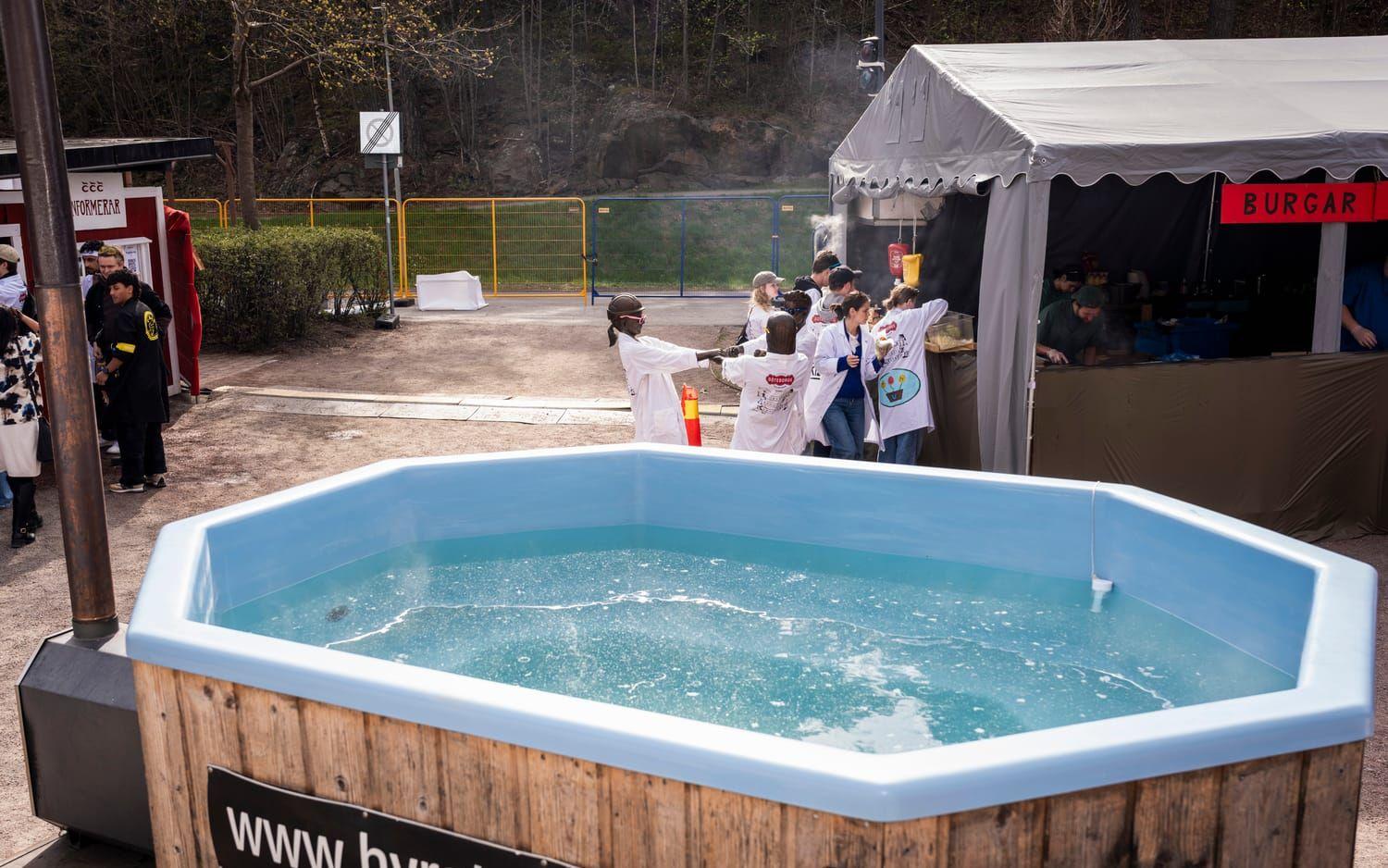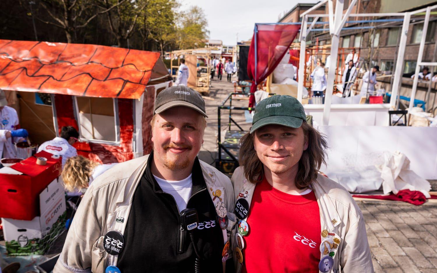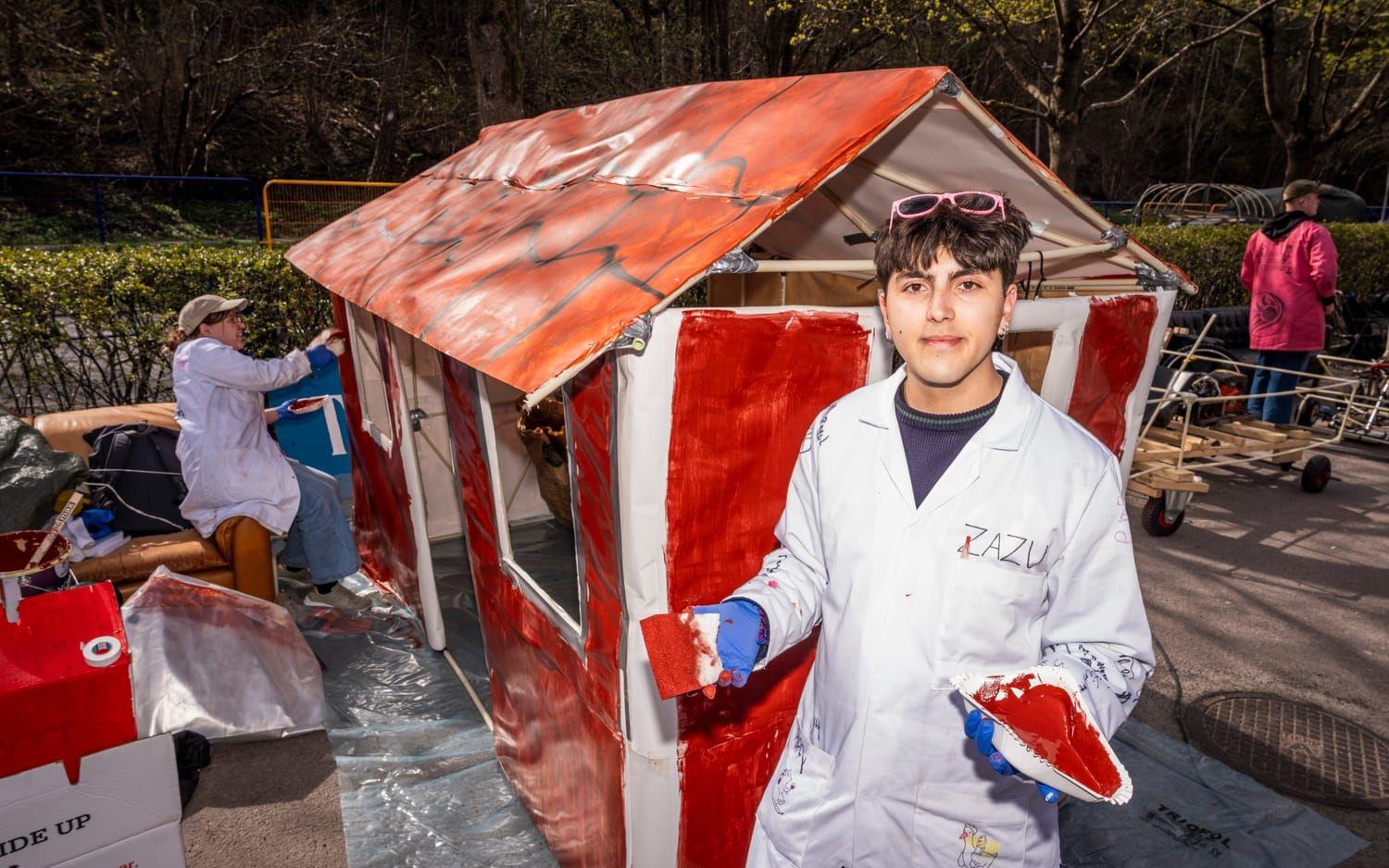För Rasmus Niiranen, ordförande för Chalmers Cortègekommitté, är det andra året han engagerar sig i cortègen. När han promenerar bland byggställningarna visar han en jacuzzi där byggare kan ta en paus och bada.