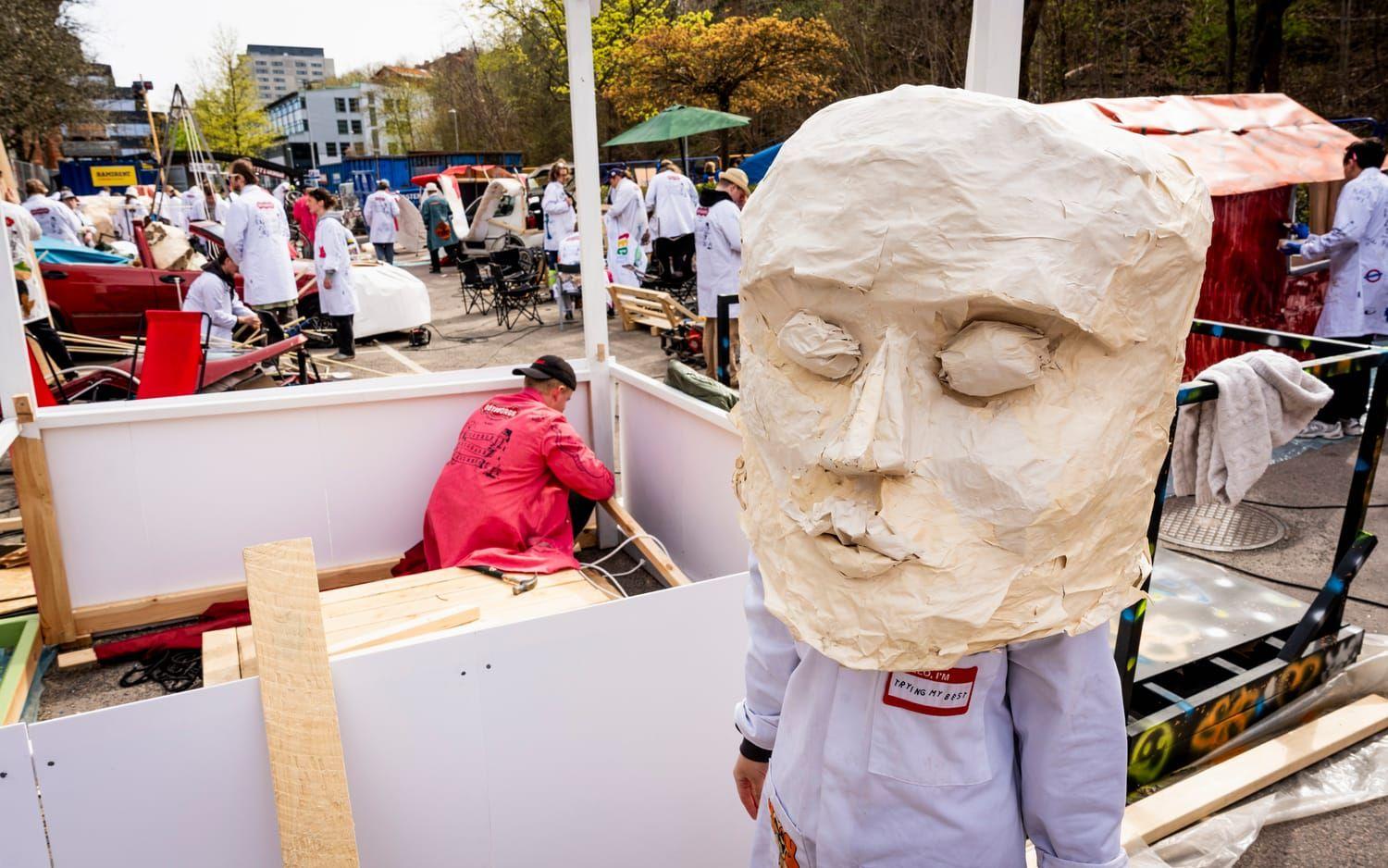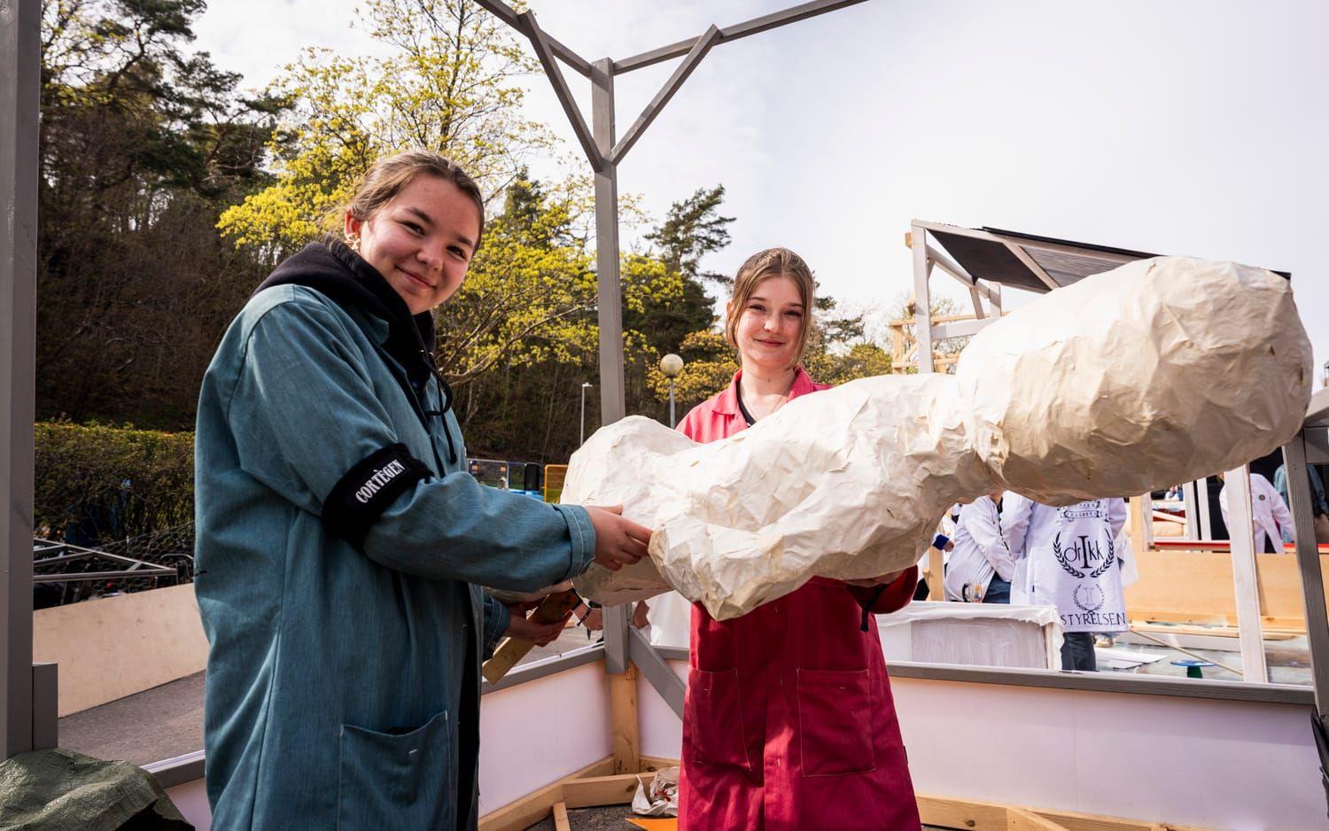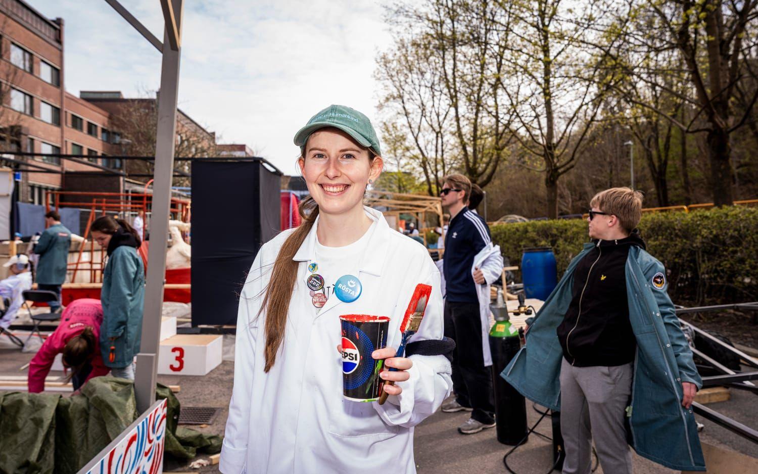 En figur gjord av hönsnät och papier-maché ligger på marken. Thyra Lundberg, som läser arkitektur på Chalmers, är i full gång med sitt första ekipage tillsammans med sitt byggarlag. Skallen ska gestalta otrohetsdramat från den uppmärksammade Coldplay-konserten där två högt uppsatta chefer avslöjades på ”the kissing cam”.