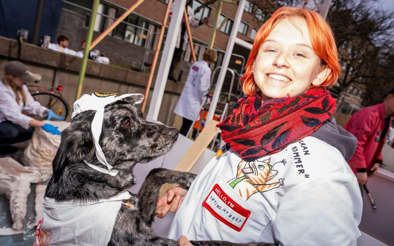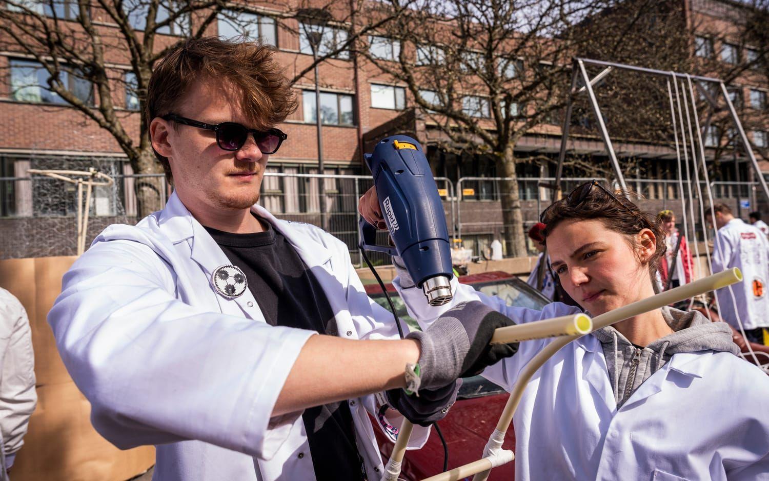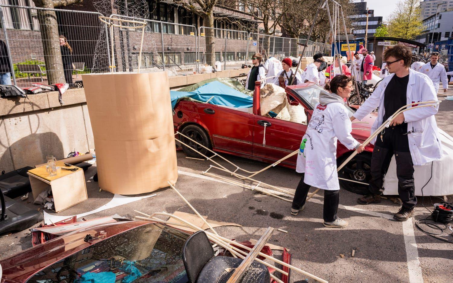 En figur gjord av hönsnät och papier-maché ligger på marken. Thyra Lundberg, som läser arkitektur på Chalmers, är i full gång med sitt första ekipage tillsammans med sitt byggarlag. Skallen ska gestalta otrohetsdramat från den uppmärksammade Coldplay-konserten där två högt uppsatta chefer avslöjades på ”the kissing cam”.