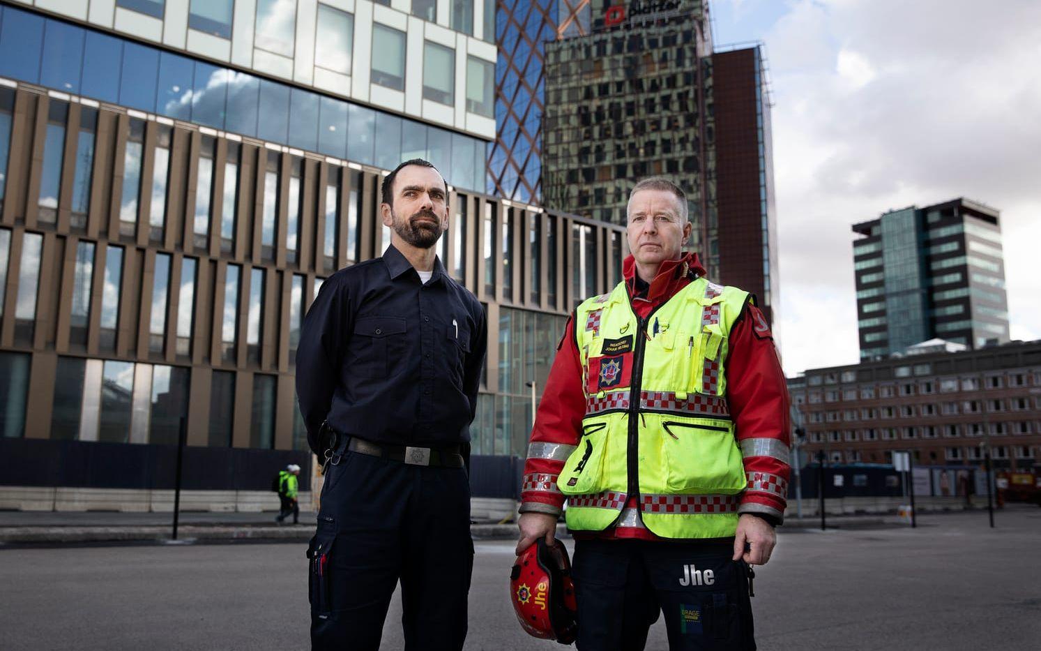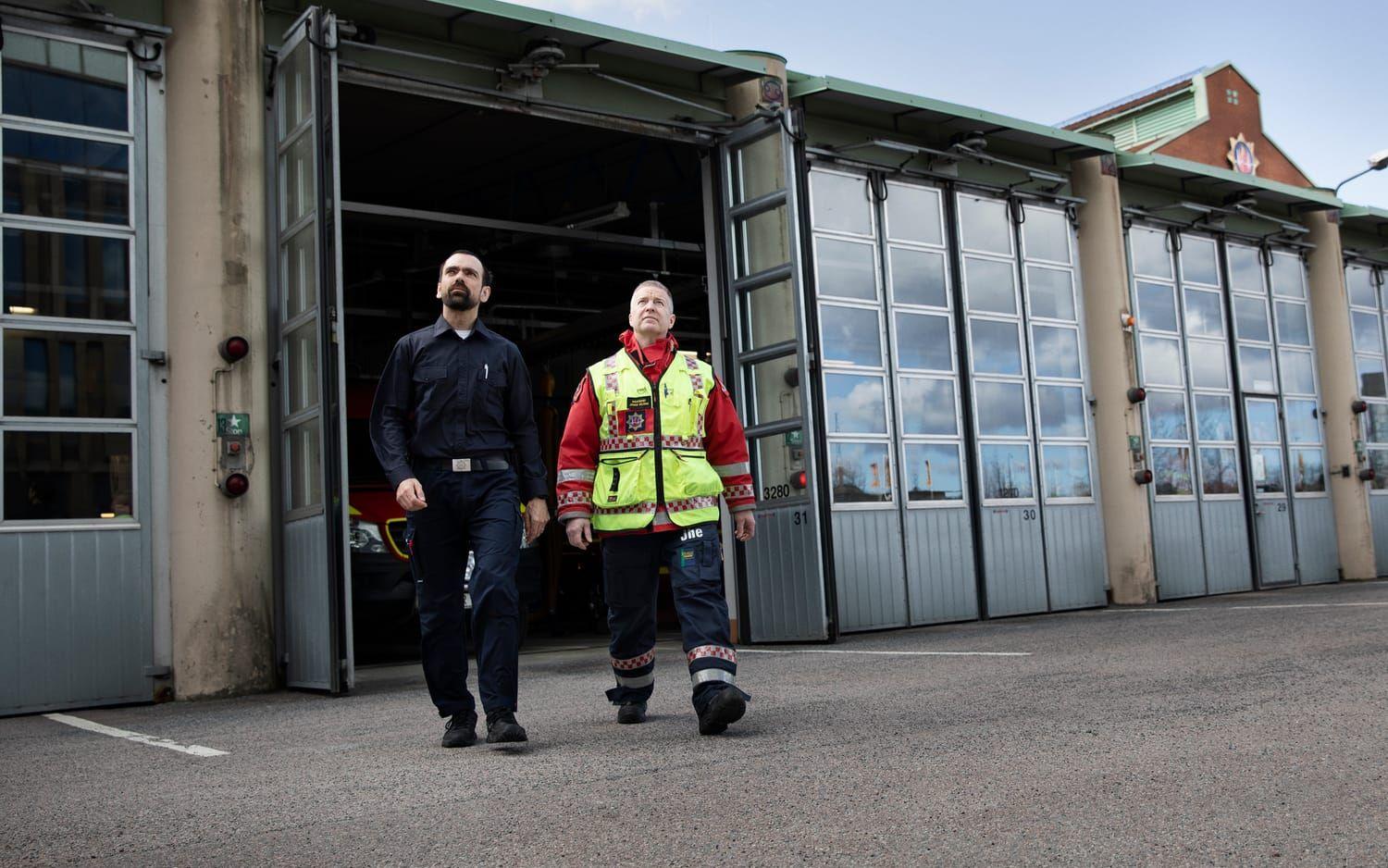 Tvärs över gatan på Gårda brandstation sitter Johan Helsing, regional insatsledare, och brandingenjören Leif Loeskow i ett inglasat mötesrum.