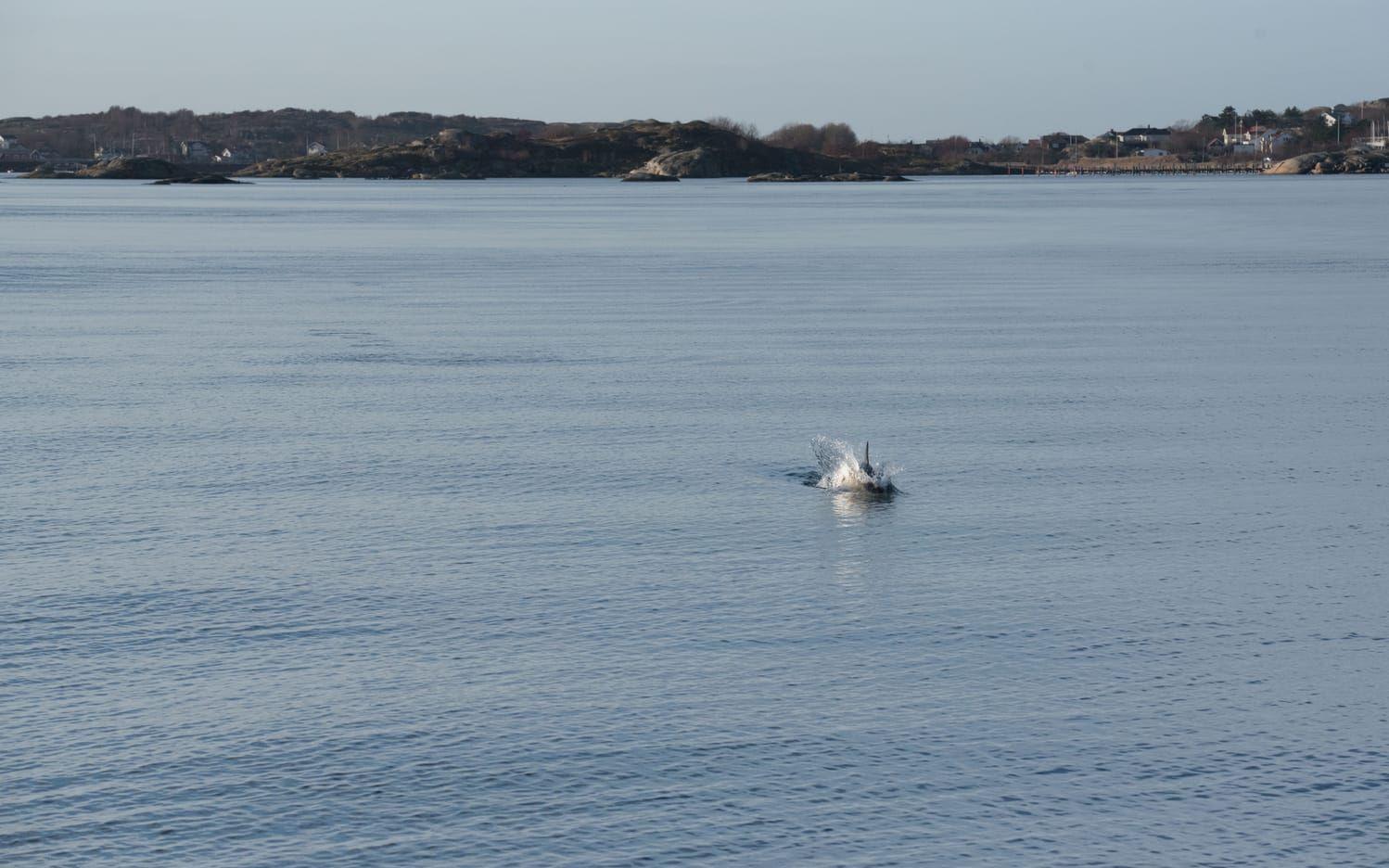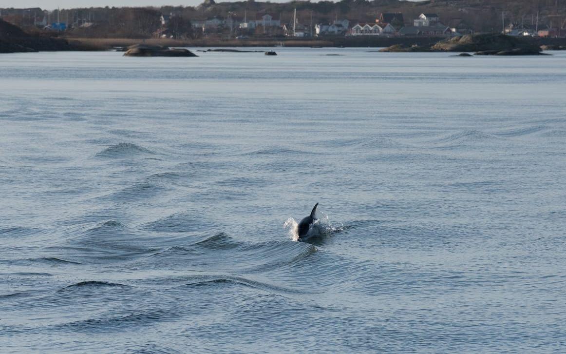 Det visar sig mycket riktigt vara en delfin som gjorde färjan sällskap mellan Hönö och Lilla Varholmen.