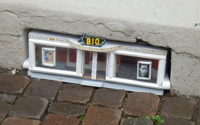 Det är filmen Casablanca som visas på biografen. Bakom musbutiken står konstnären Staffan Lindholm.