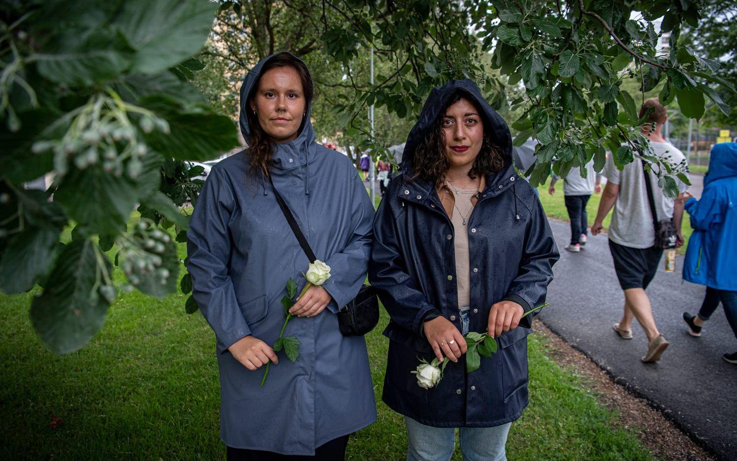 Hundratals promenerade mot våldet i Biskopsgården, från Länsmanstorget till Vågmästareplatsen. Gabriella Toftered och Simona Mohamsson (L) går med i tåget. Bild: Mia Höglund