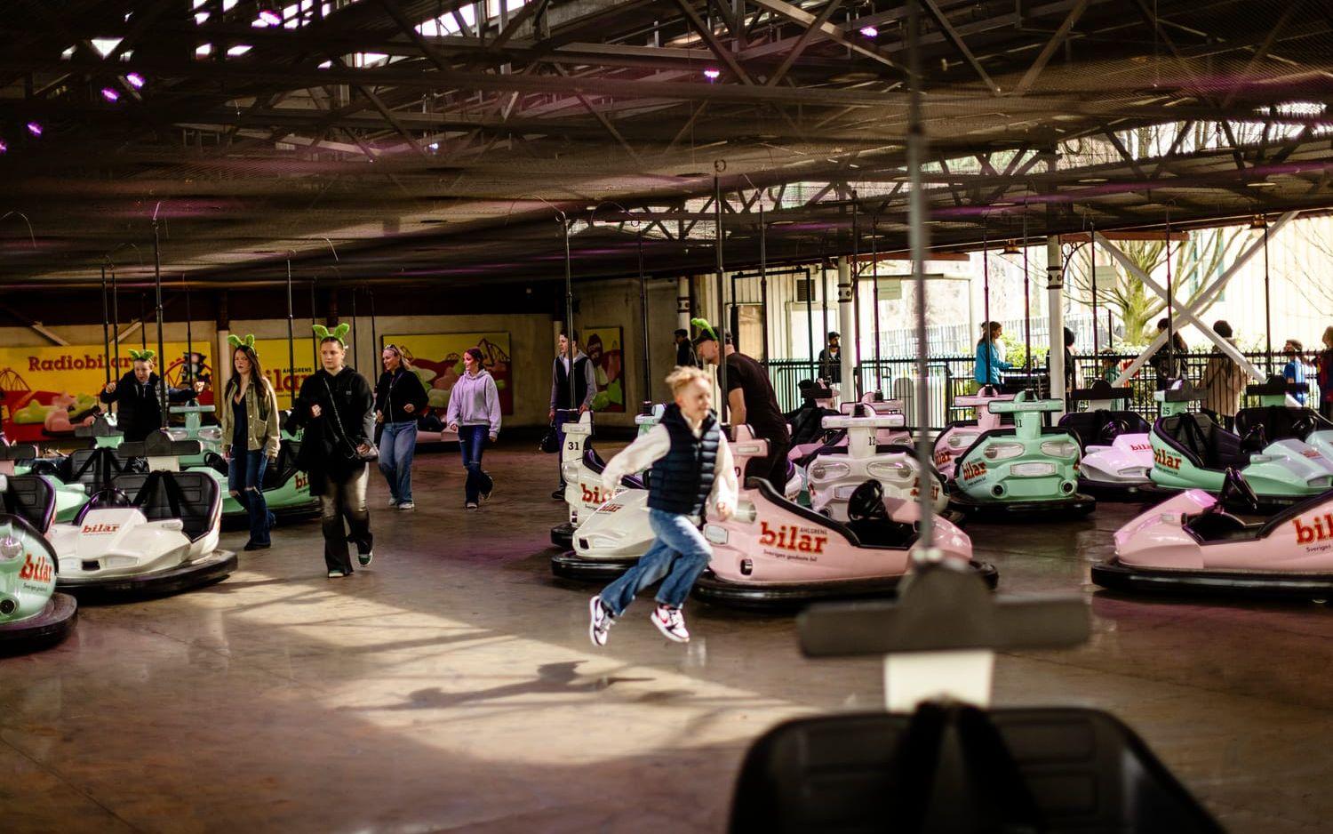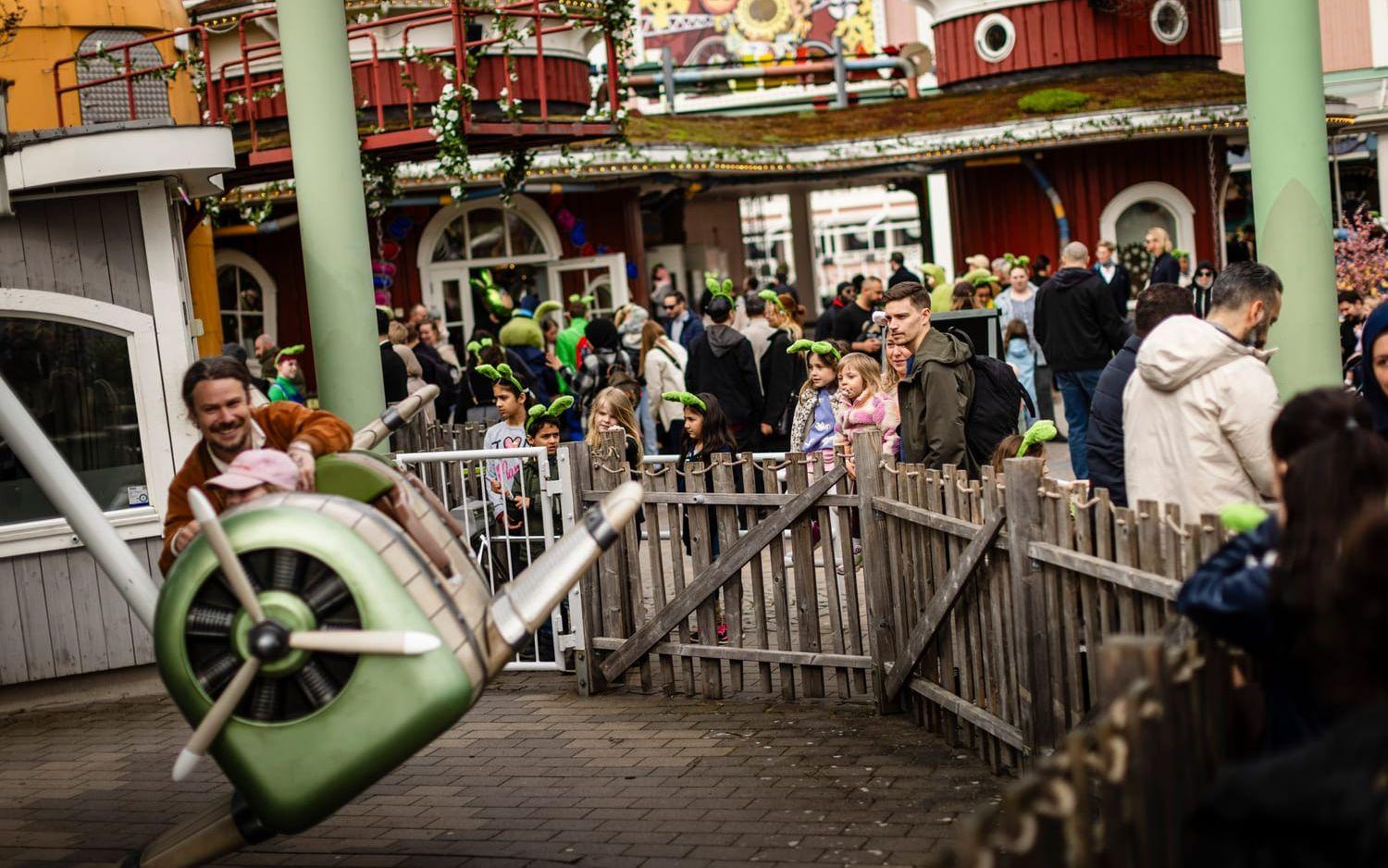 Dagen till ära välkomnas besökarna att göra entré på en intensivt rosa matta. Snart möts de också av skratt och skrik som ekar från parkens attraktioner.
