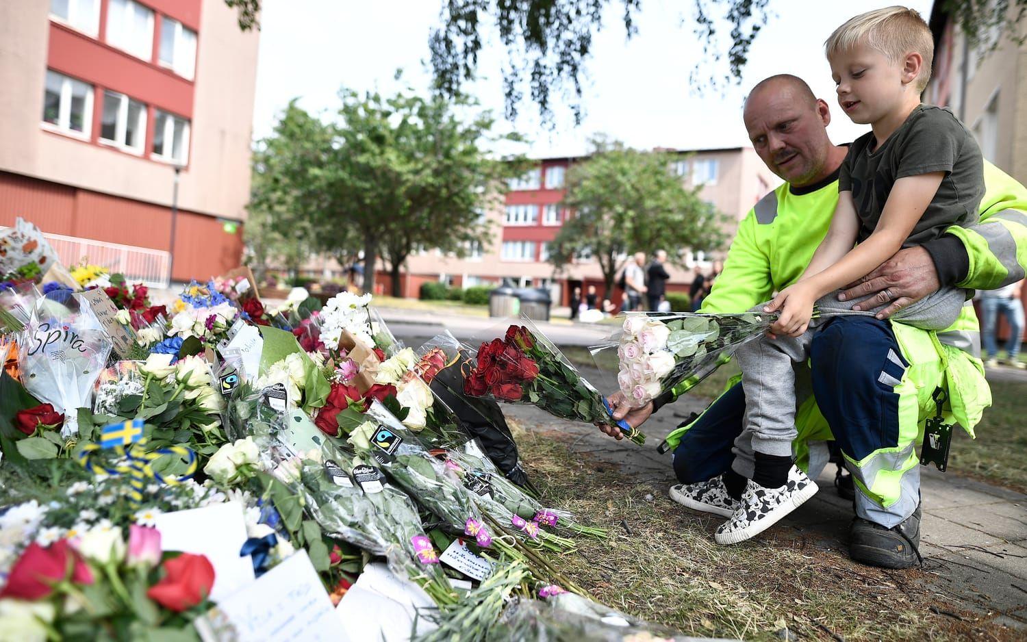 I närheten av mordplatsen i Biskopsgården har många lämnat blommor.