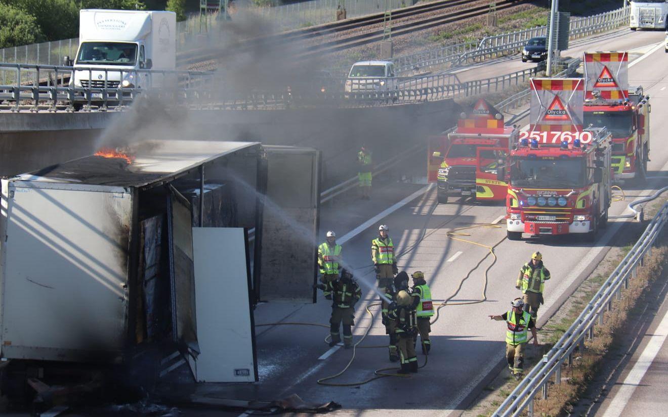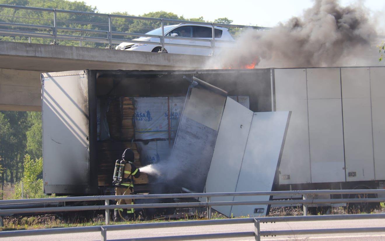– Det är ett släp till en lastbil som brinner och det är en kraftig rökutveckling så vi har stängt av vägen helt i södergående riktning, säger Mats Gränsmark, larm- och ledningsoperatör på räddningstjänsten Storgöteborg.