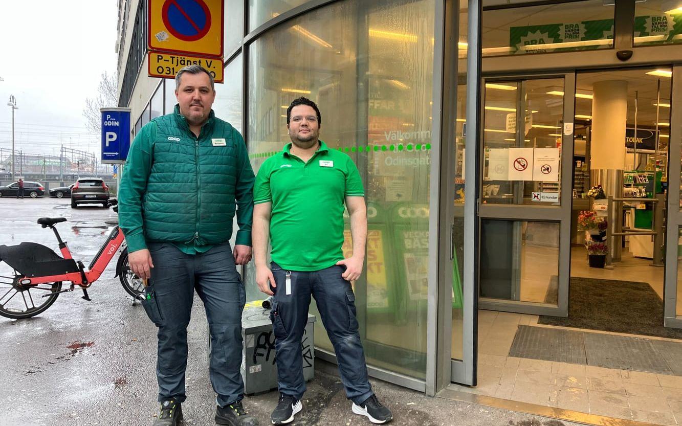 På Odinsgatan i Göteborg kunde butiken under stora delar av dagen bara ta emot kontanter. I entrén stannade butikschefen Benjamin Hodzic, och butiksbiträdet Ali Kathem alla personer som är på väg in i butiken.