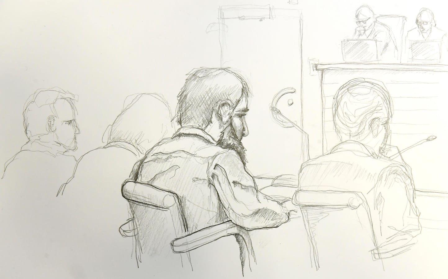 Akilov höll händerna för ansiktet medan åklagaren beskriver hur ett av de 950 kilo tunga betonglejonen har krossat en människa.