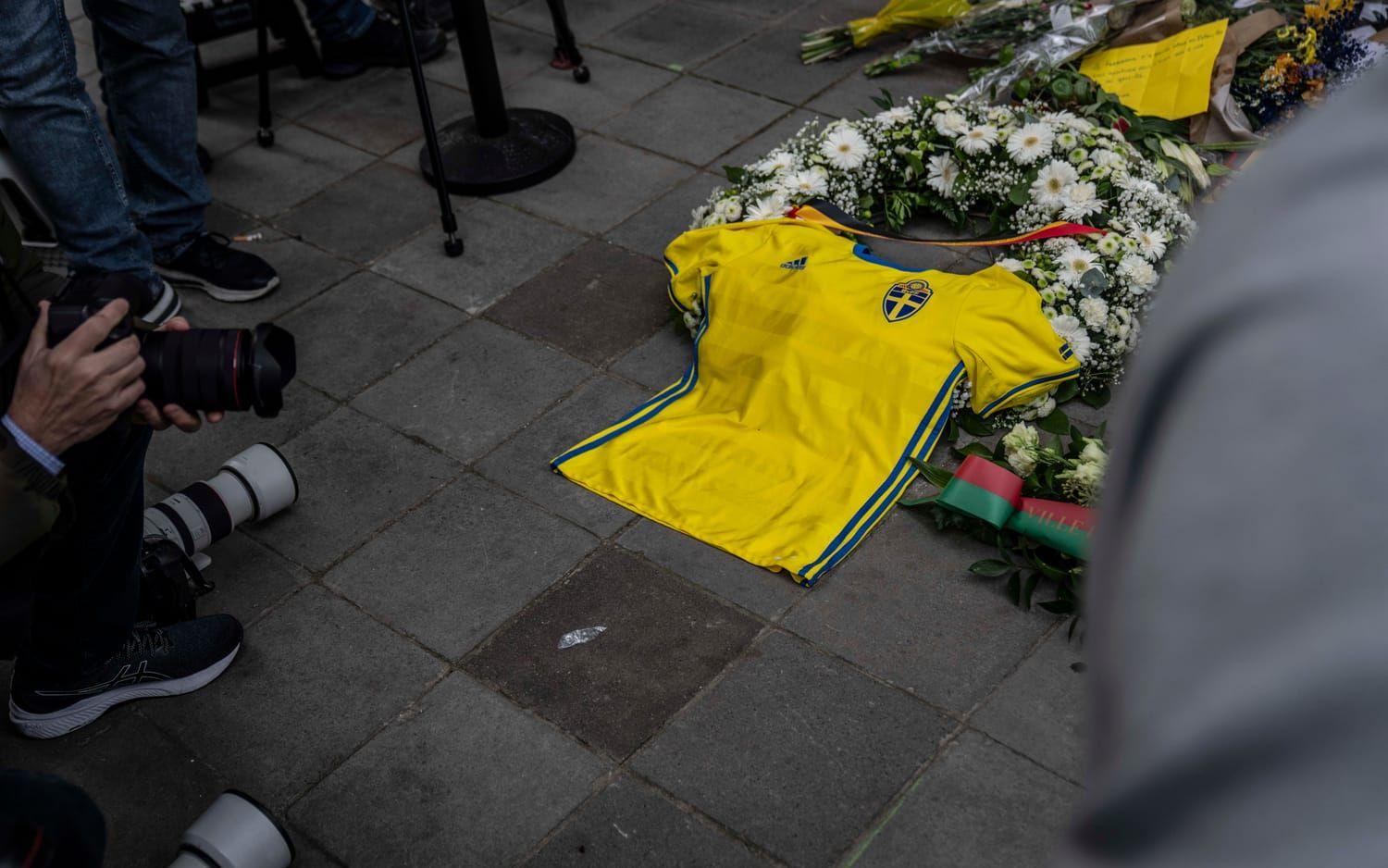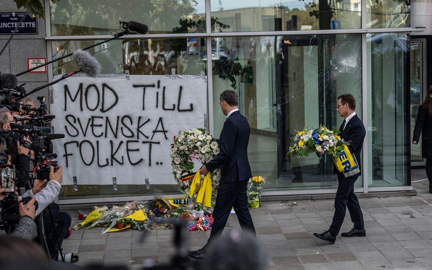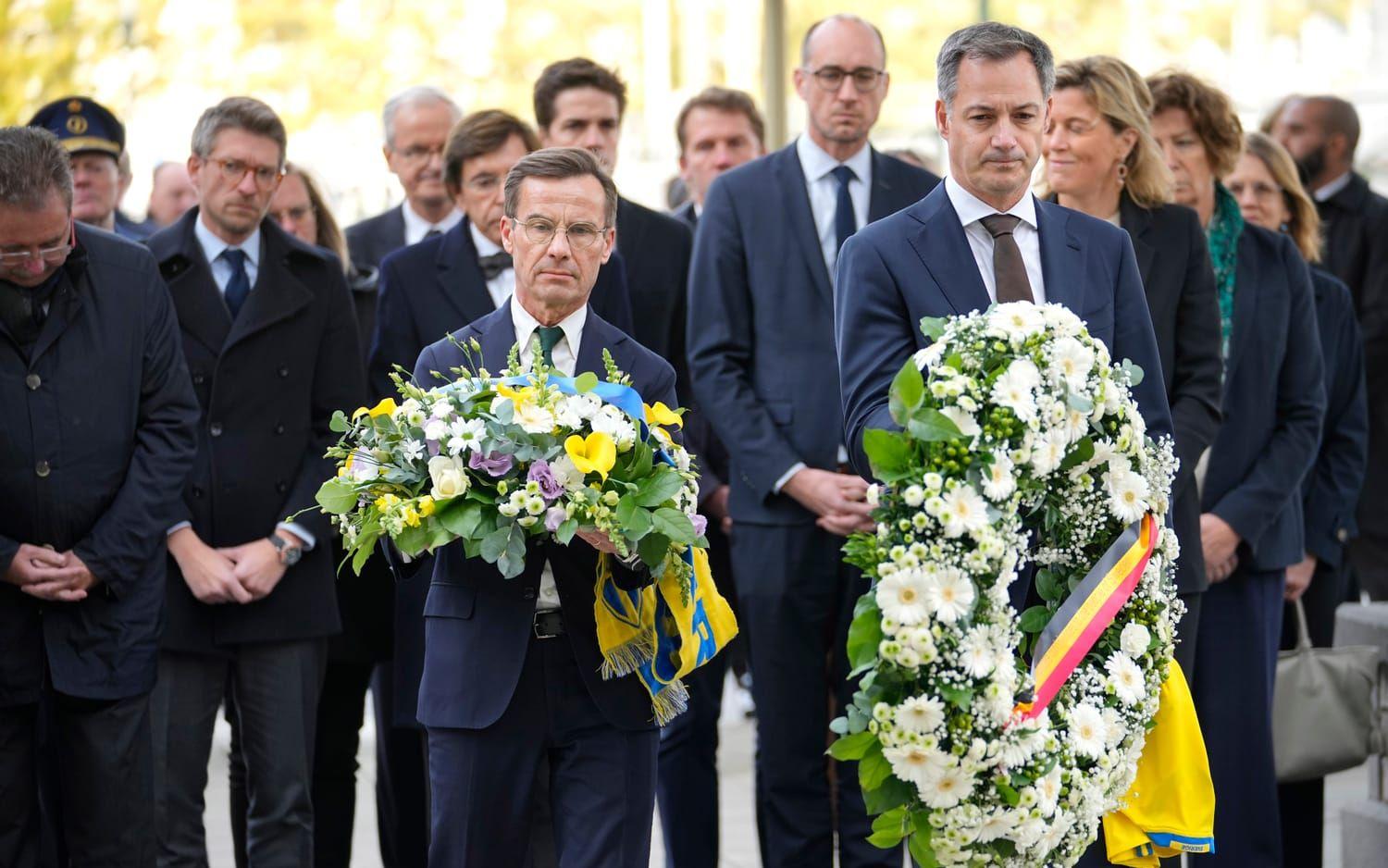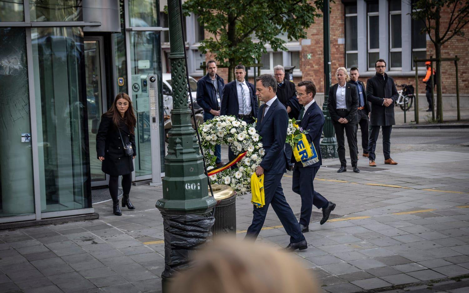 Ulf Kristersson gick tillsammans med Belgiens premiärminister Alexander de Croo och lade ner varsin blomsterkrans vid byggnaden där skotthålen fortfarande syns. Ovanpå kransarna placerades halsduken och en Sverige-tröja, som Alexander de Croo hållit i handen.