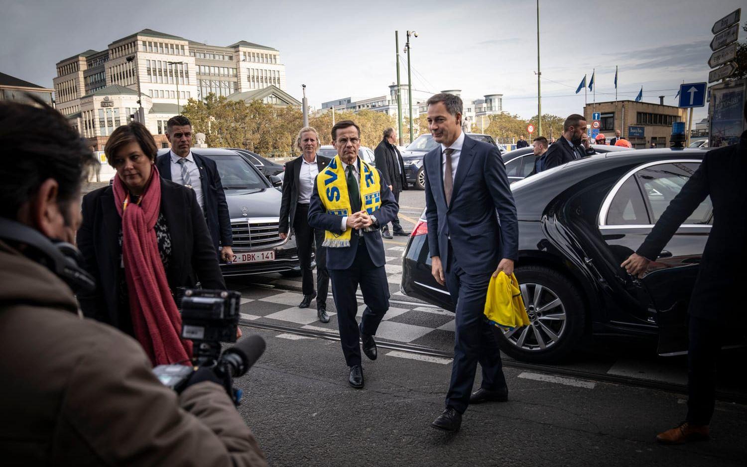 Efter ceremonin mötte politikerna pressen inne på Rue de la loi 16, den belgiska regeringens officiella högkvarter. Alexander De Croo inledde med att vända sig direkt till Kristersson och Sverige.