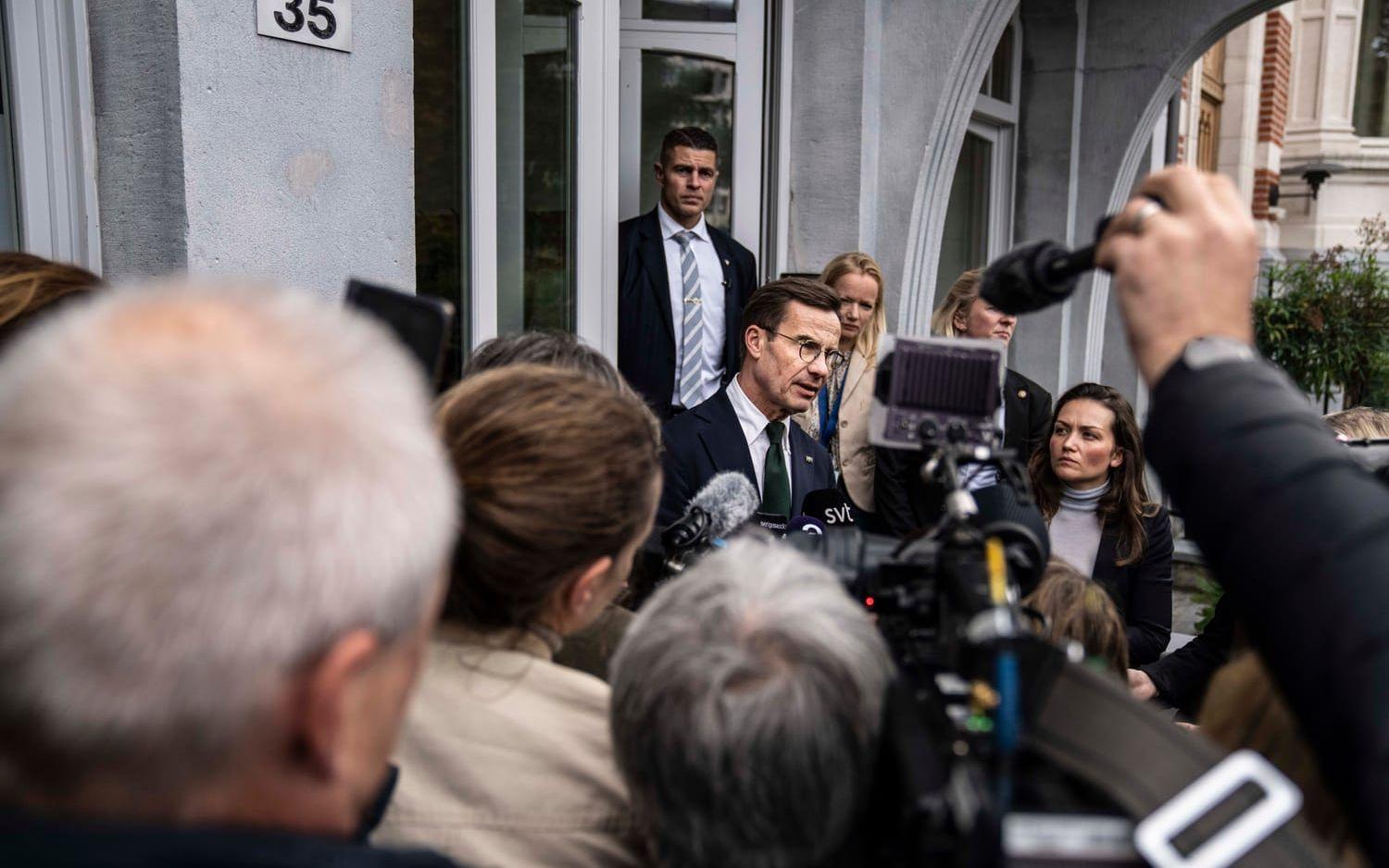 Det var ett stort pådrag i Bryssel när Ulf Kristersson anlände till platsen där två svenskar sköts ihjäl i måndags. Poliserna som eskorterade honom kom på motorcyklar och i svarta bilar med tonade rutor. När Ulf Kristersson klev ut bar han en Sverige-halsduk.