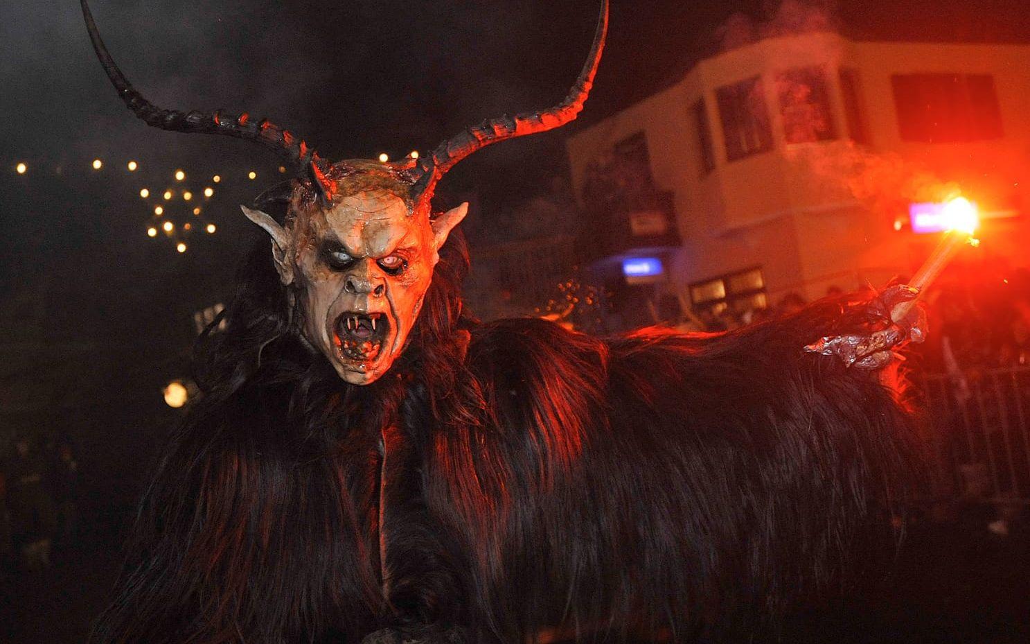 Krampus är en halvdemon och hälften get, med långa horn och djävulska ansiktsdrag. Han är följeslagare till den snälla Sankt Nikolaus som kommer med gåvor den 6 december.
