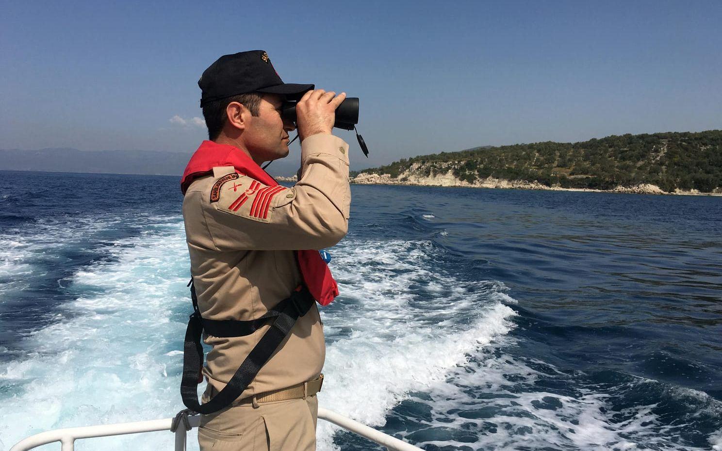 En anställd vid turkiska kustbevakningen spanar efter migranter i vattnen mellan Turkiet och Grekland.