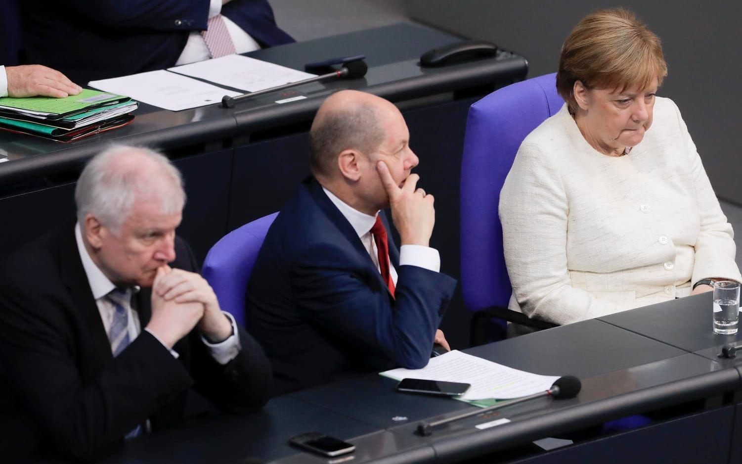 Tysklands inrikesminister Horst Seehofer (CSU), finansminister Olaf Scholz (SPD) och förbundskansler Angela Merkel (CDU) vid en debatt i förbundsdagen tidigare i veckan.