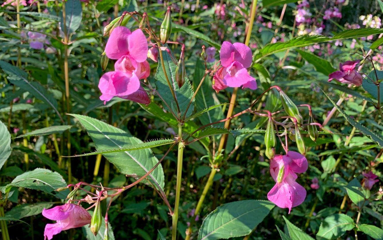 Jättebalsamin: Kan bli över två meter hög. Har gröna taggiga blad, rosaaktiga blommor och relativt grunda rötter. Blommorna har mycket nektar och befaras därför kunna stjäla pollinatörer, som bin och humlor, från andra växter. Men bestånden kan också bli stora och täta och täcka annan vegetation på platsen.