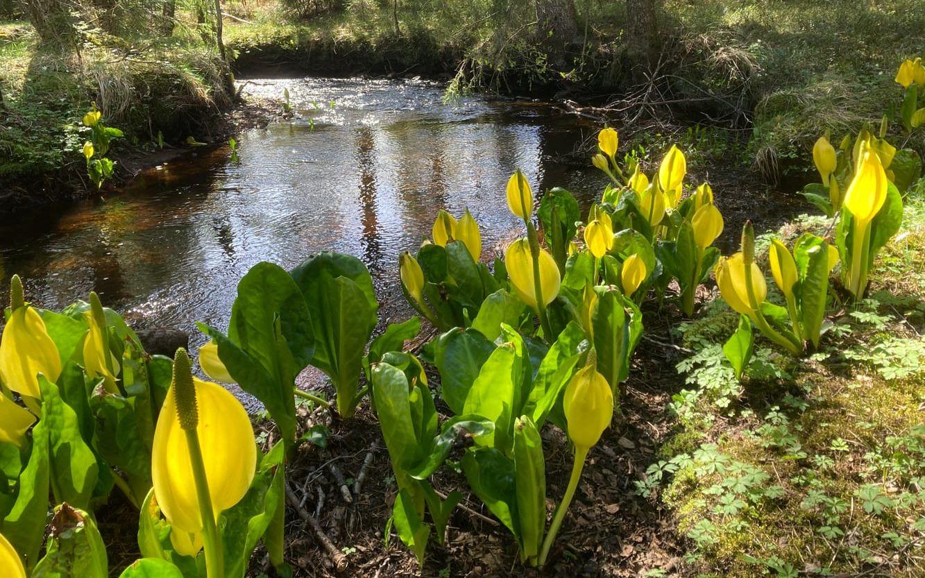 Gul skunkalla: Även skunkkallans bestånd blir täta, men den har också meterhöga blad som skuggar ut andra växter. Den växer där det är fuktigt och kan också dämma upp vatten och påverka fisk negativt.