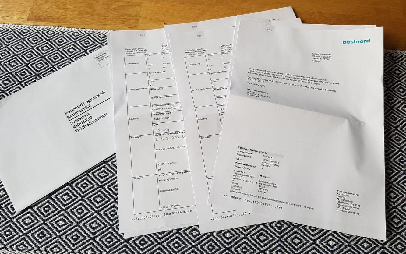 Mikael berättar han vid nästa steg blev tvungen att kontakta återförsäljaren i Tyskland. Hos det tyska företaget fick han svaret att de inte kunde göra något då paketens status i systemen fortfarande låg som att det var på väg för att levereras till honom, ett besked som ledde fram till ett nytt samtal till Postnord för Mikael Hjörnhede.