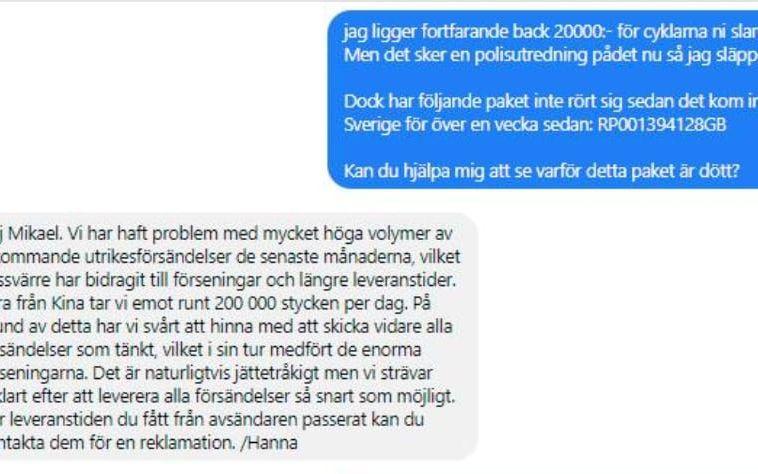 Mikael har under sommaren och hösten varit i upprepad kontakt med Postnord gällande försvunna eller försenade paket. Så här ser en av hans konversationer med bolagets kundservice ut.