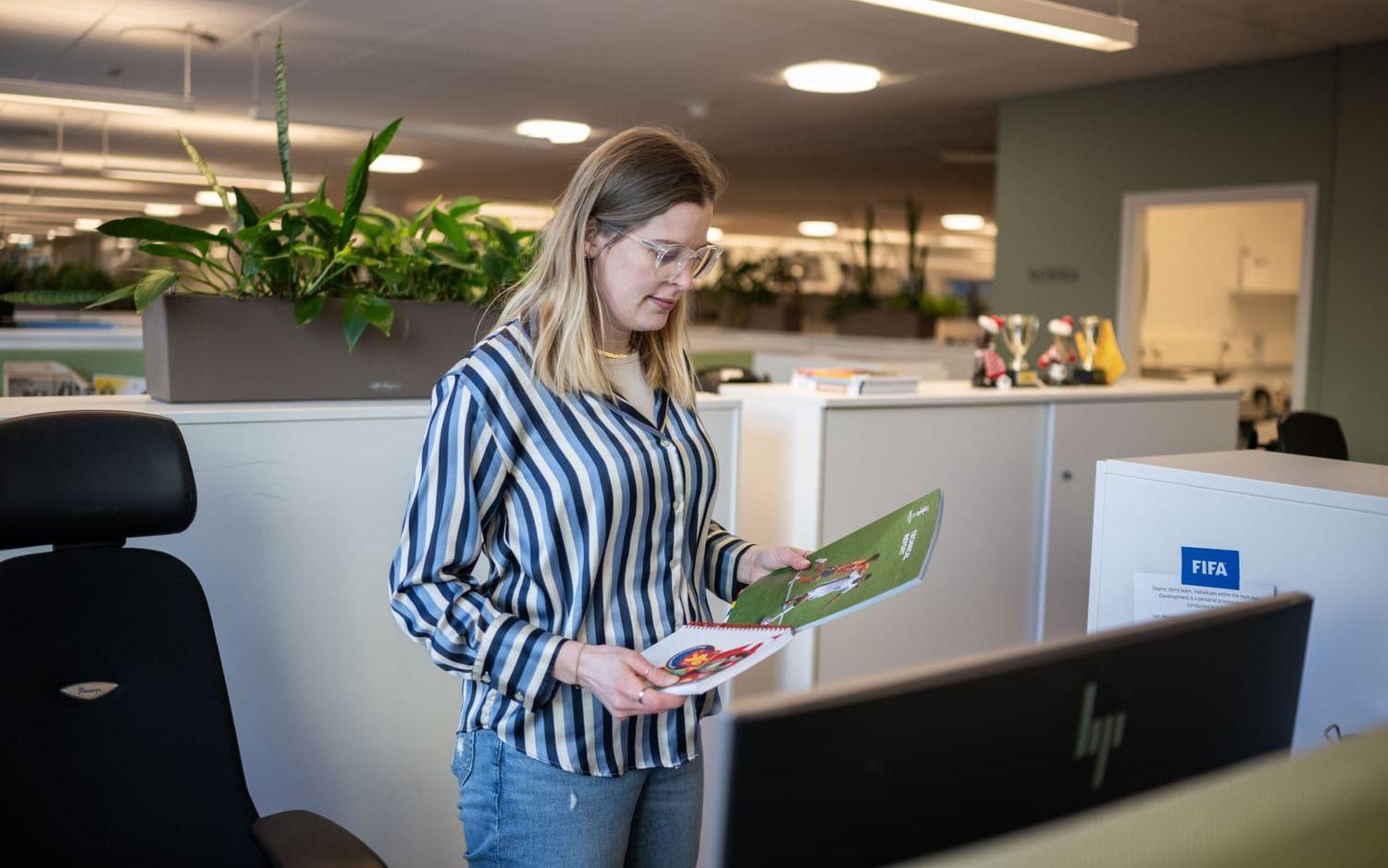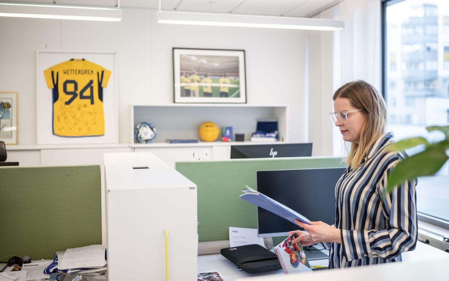 Det är också till synes ingen särskilt händelserik dag i de ljusa lokalerna i Solna, en vecka före jul. Fotbollschefen Kim Källström har lätt studs i steget, U21-förbundskaptenen, den erkänt nördige Daniel Bäckström, sitter på sin kala plats med en laptop. Landslagschefen Stefan Pettersson ser djupt fokuserad ut, troligen ska herrlandslagets marssamling planeras. Den pikéförsedde domarchefen Stefan Johannesson hämtar kaffe.