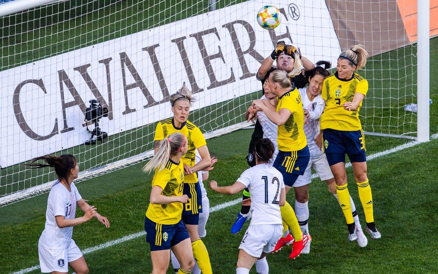 Sverige, med småskadade Caroline Seger och Olivia Schough på läktaren, inledde bäst de första minuterna och både Lina Sembrant och Stina Blackstenius hade ett par halvchanser tidigt att öppna målskyttet – men sedan var det faktiskt lika mycket Sydkorea.