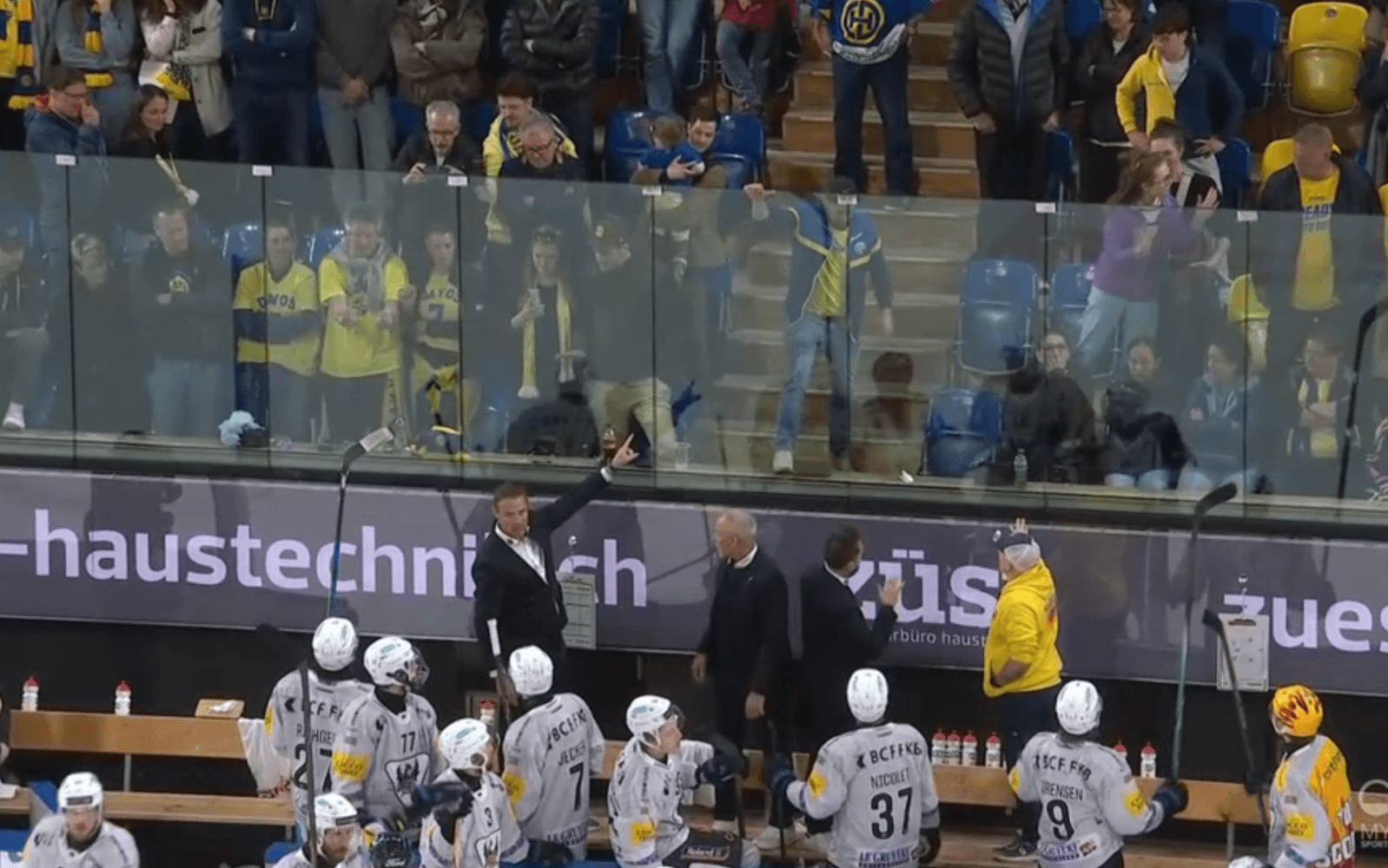I slutsekunden av matchen i Davos, som Fribourg vann med 3–2, rann det över för en hemmasupporter när Davosspelaren Brendan Lemieux fick matchstraff efter att han sänkt Fribourgs Christoph Bertschy och bråk utbröt på isen.